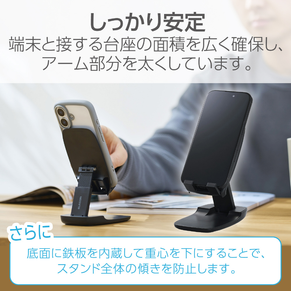 安定性を高めるために、端末と接する台座の面積を広く確保し、アーム部分を太くしています。さらに底面に鉄板を内蔵して重心を下にすることで、スタンド全体の傾きを防止します。