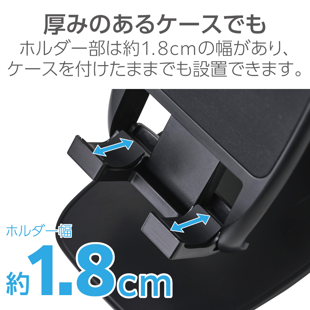 ホルダー部は約1.8cmの幅があり、ケースを付けたままでも設置できます。