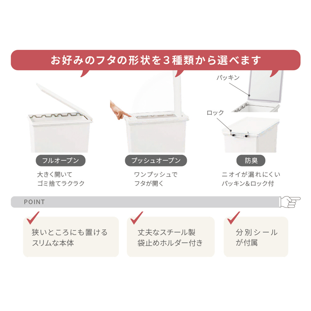 フルオープン、プッシュオープン、防臭フタパッキン付きの3タイプからお選び頂けます。