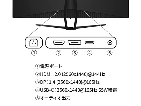 ■インターフェイスは、HDMI 2.0 x1 (144Hz)、DisplayPort 1.4 x1 (165Hz)、USB Type-C x1 (165Hz/最大65W給電)を搭載し、様々な機器との接続が可能です。USB-C(最大65W給電)は、対応のPCであればUSB-Cケーブル1本でモニターへの映像出力とノートPCへの給電が可能。ケーブル1本でスッキリ接続出来るだけでなく、テレワーク、出社併用の場合などノートPCのACアダプターを持ち運ぶ必要が無くなります。