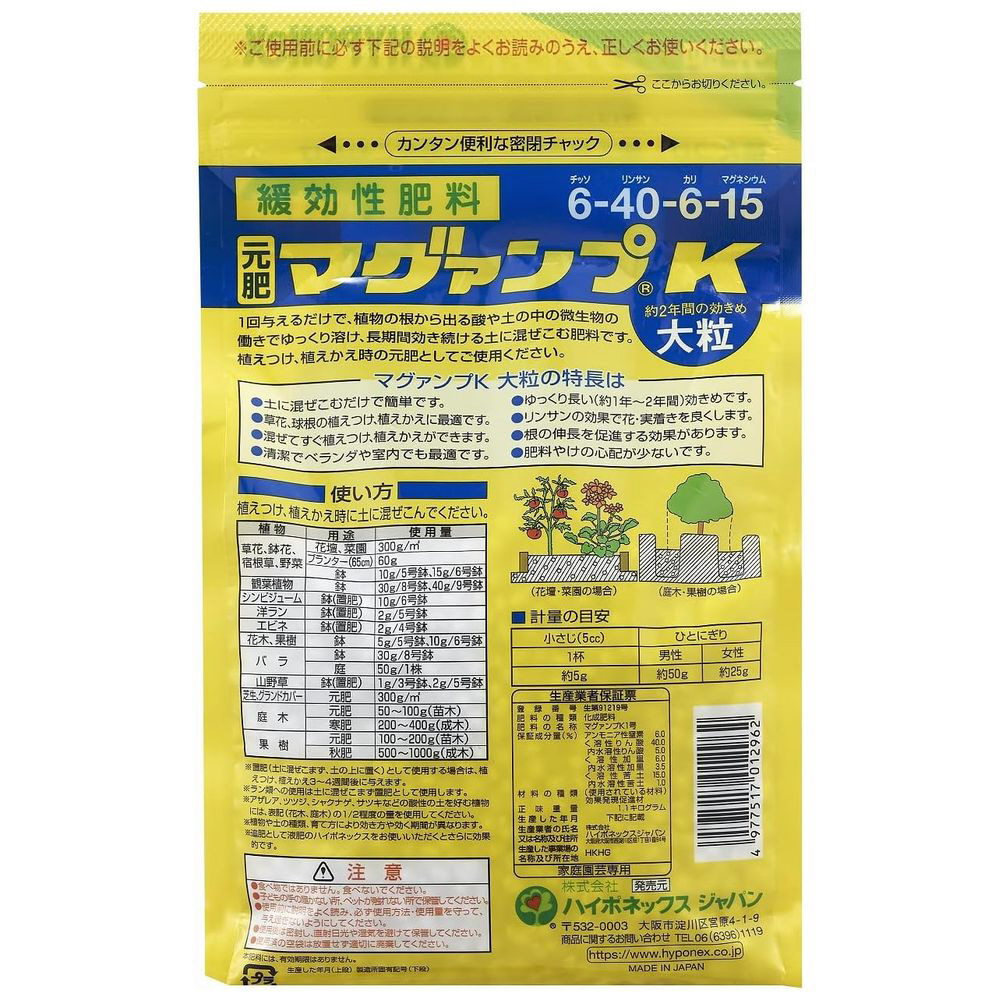 仕様2 成分:N(チッソ)-P(リンサン)-K(カリ)-Mg(マグネシウム)=6-40-6-15 マグネシウム配合