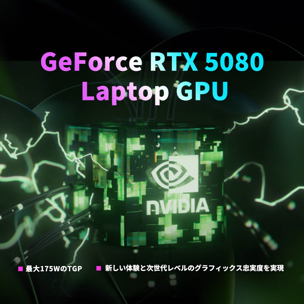 NVIDIA Blackwellアーキテクチャを採用したGeForce RTX 50シリーズLaptop GPUは、ゲーマーやクリエイターの皆様に革新的な体験を提供します。圧倒的なAI 処理能力を備えたRTX 50シリーズにより、これまでにない新たな体験と次世代のグラフィック表現を実現します。さらに、NVIDIA DLSS 4によるパフォーマンス向上、驚異的なスピードでの画像生成、そしてNVIDIA Studioによる創造力の最大化をサポートします。