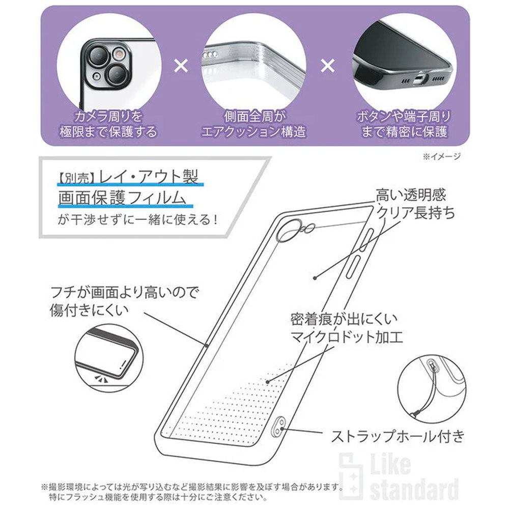 カメラ周りを極限まで保護する。高い透明感、クリア長持ち。密着痕が出にくいマイクロドット加工。