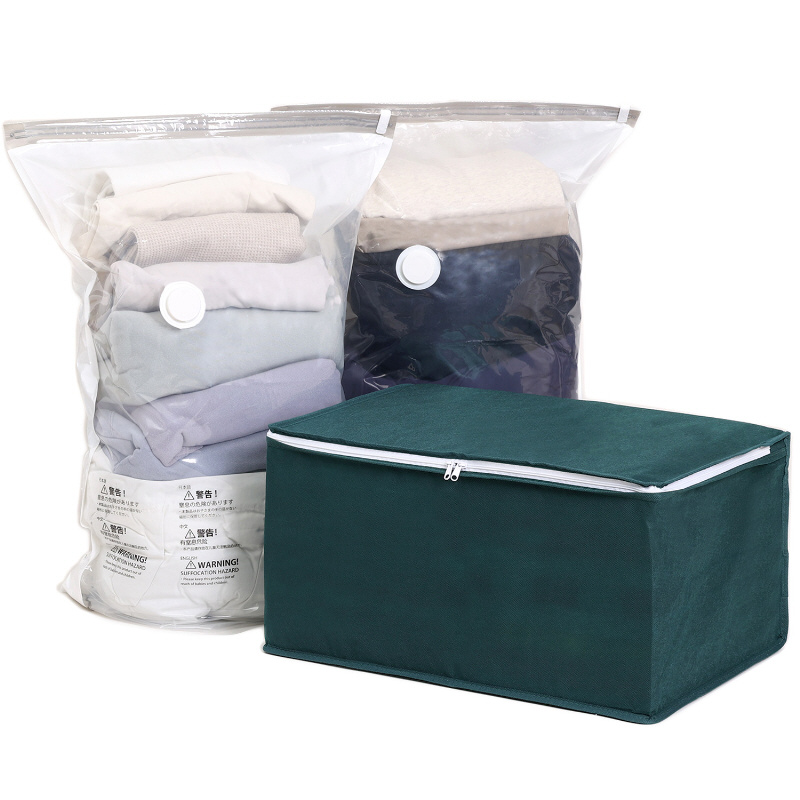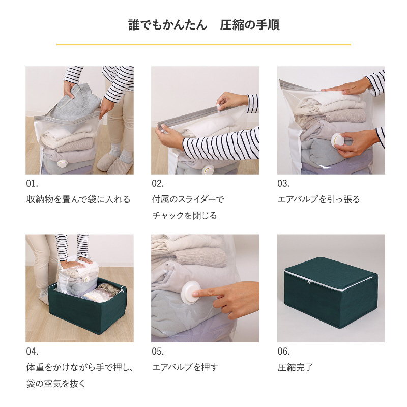 マチ付きでたっぷり収納できる手押しタイプの圧縮袋と不織布製の収納ケースのセット。