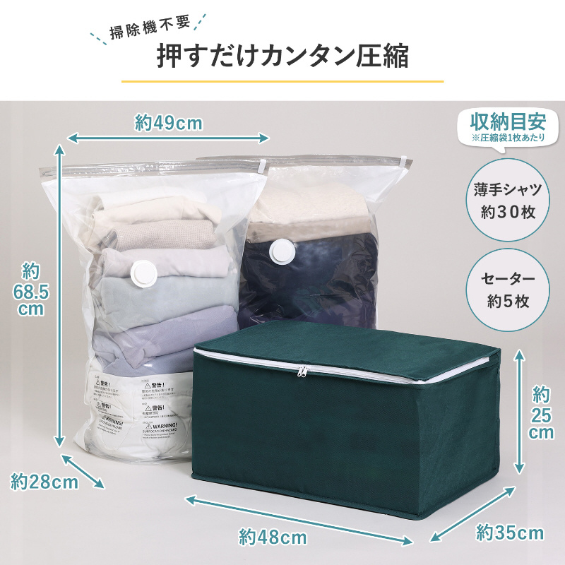 サイズ/(圧縮袋)約幅49×奥行28×高さ68.5cm・(収納ケース)約幅48×奥行35×高さ25cm、内容/圧縮袋2枚・収納ケース1枚、収納目安(圧縮袋1枚あたり):薄手シャツなら約30枚、セーターなら約10〜15枚、タオルケットなら約3〜4枚