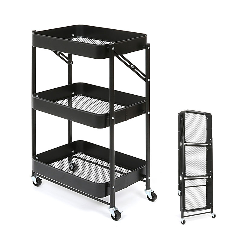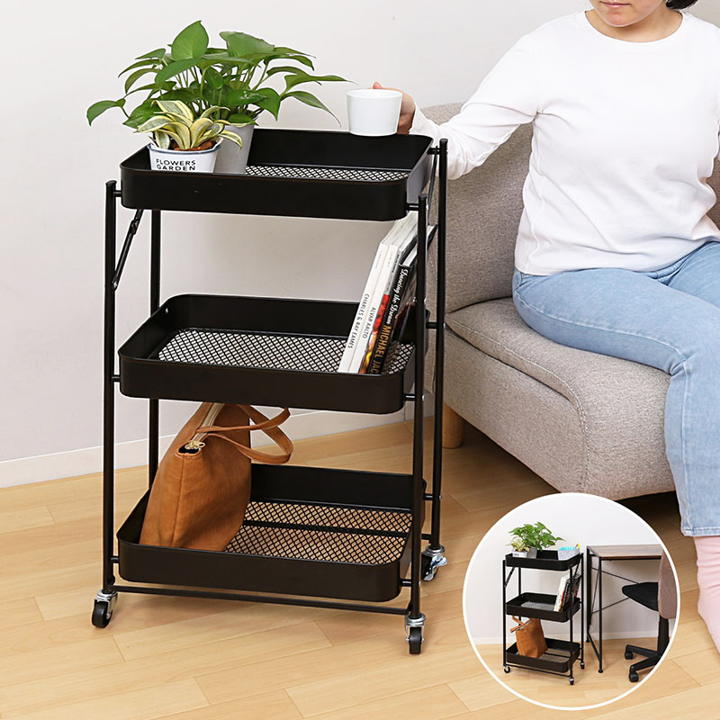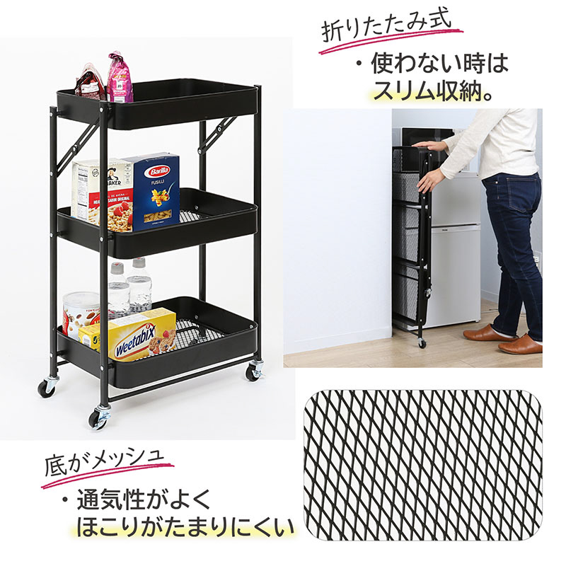 組み立て不要で使いたいときに広げてすぐに使える折りたたみワゴン。