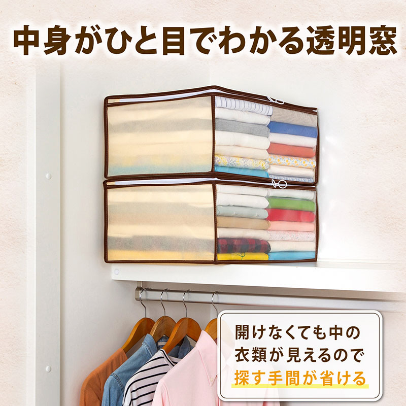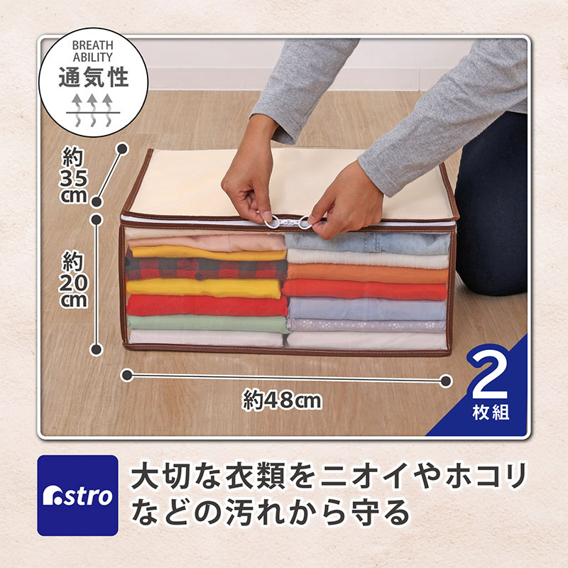 サイズ/約幅48×奥行35×高さ20cm、カラー/ベージュ、内容/2個、収納目安/長袖シャツなら約20〜25枚・セーターやトレーナーなら約5〜7枚、材質/ポリプロピレン・ポリエチレン