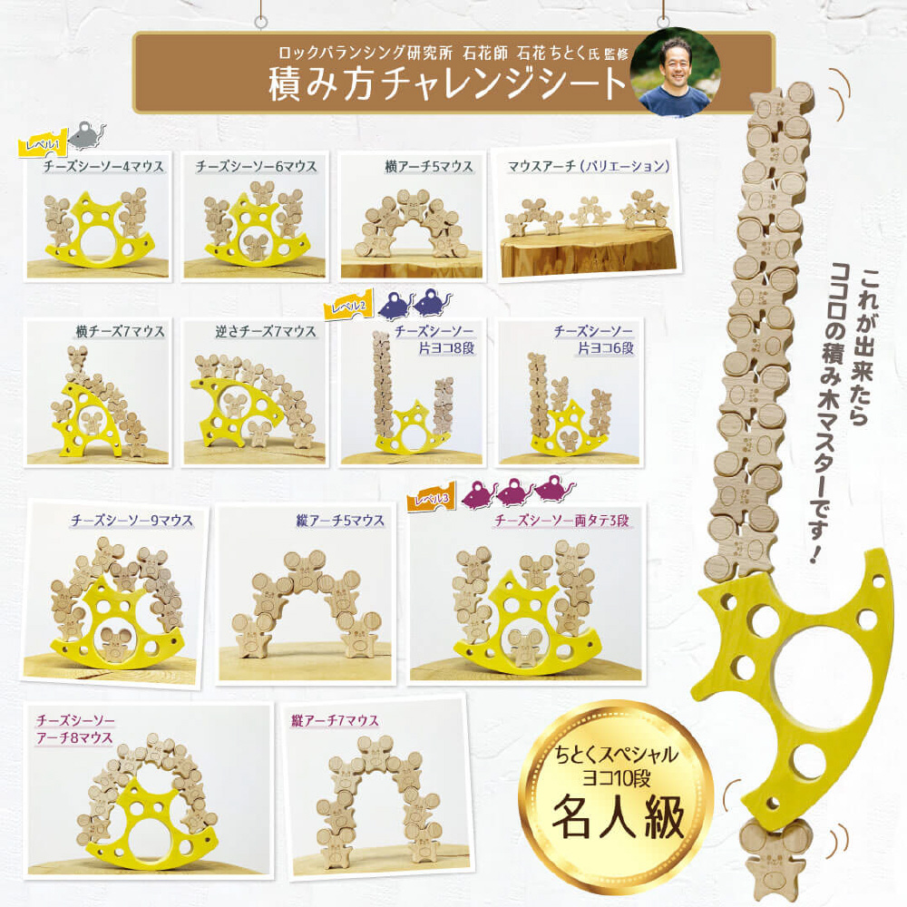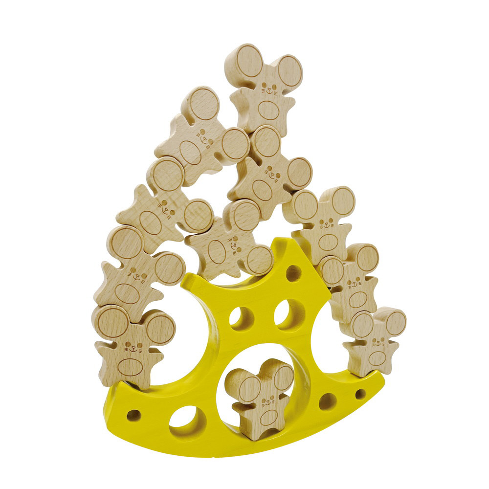 天然木のやさしい風合いで作られた16匹のねずみたちと大きなチーズを上手に積み上げよう