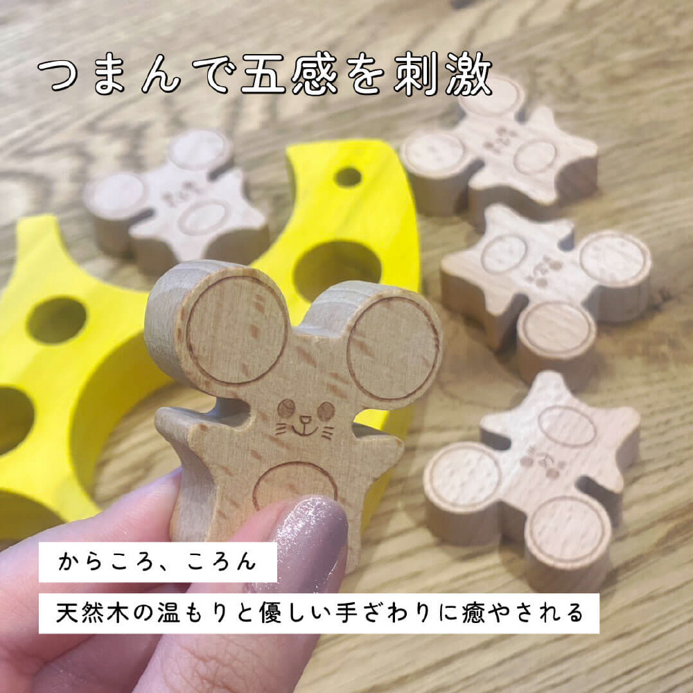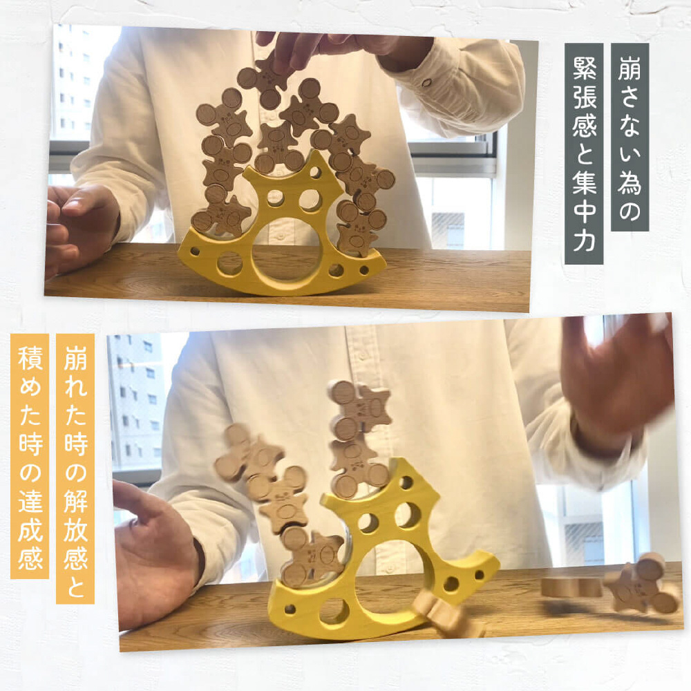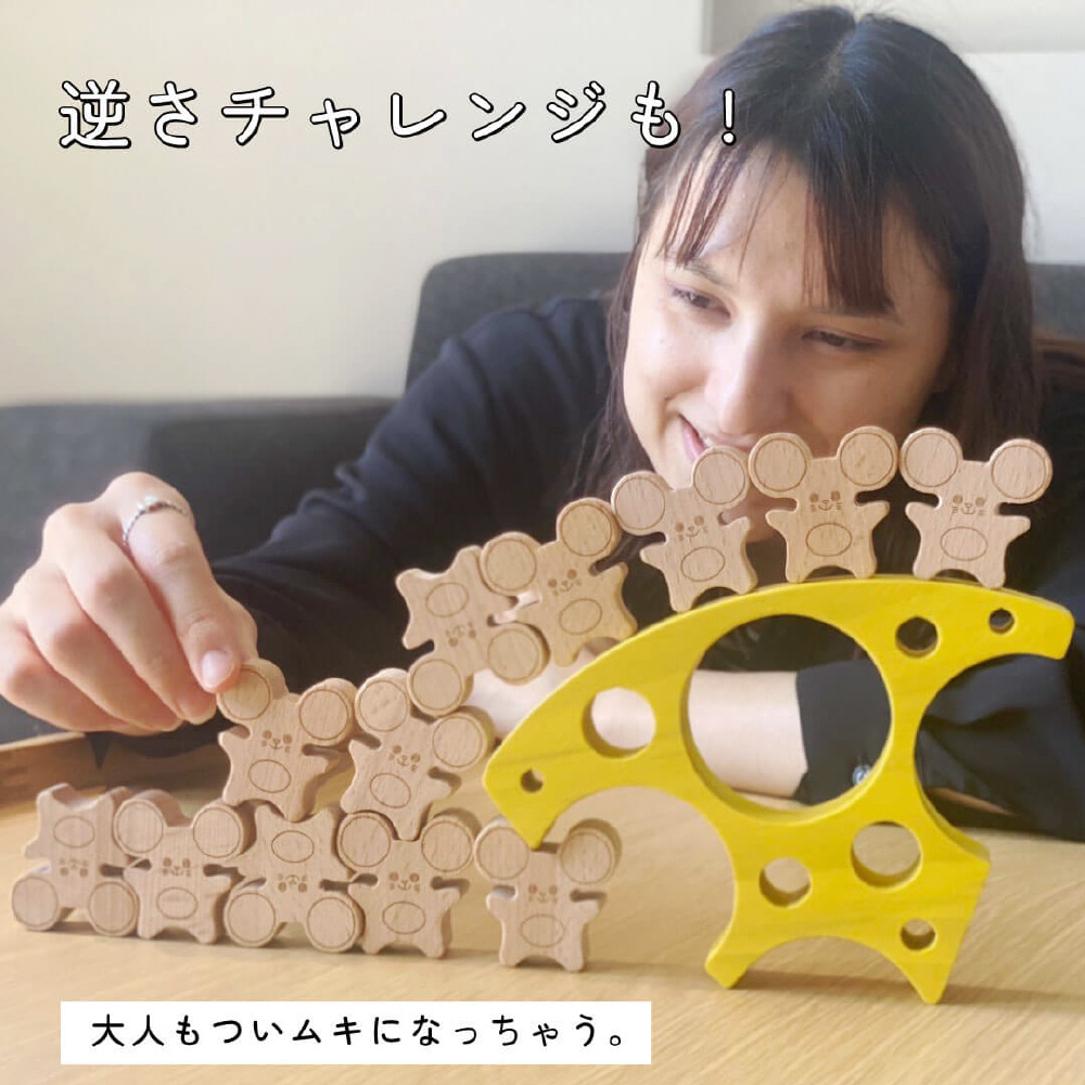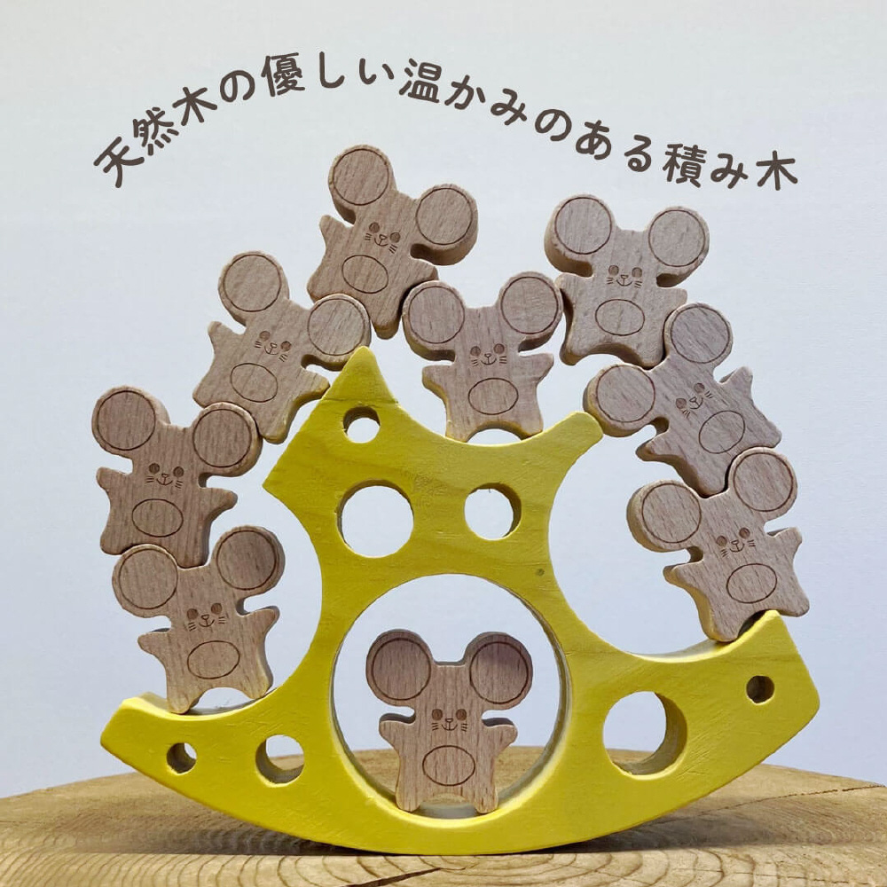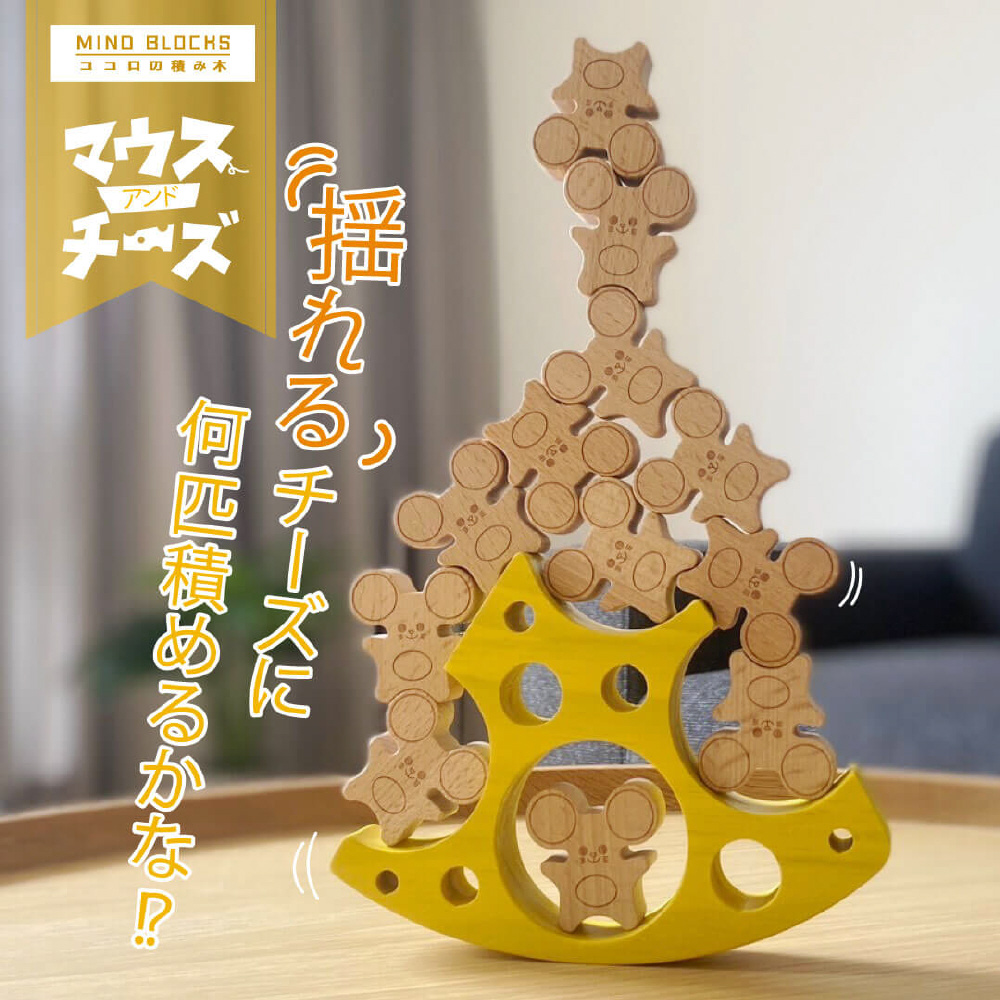 チーズやネズミをうまく使って積み上げて、高さや積んだ個数を競ったり、交互に積み上げたりと遊び方も様々。