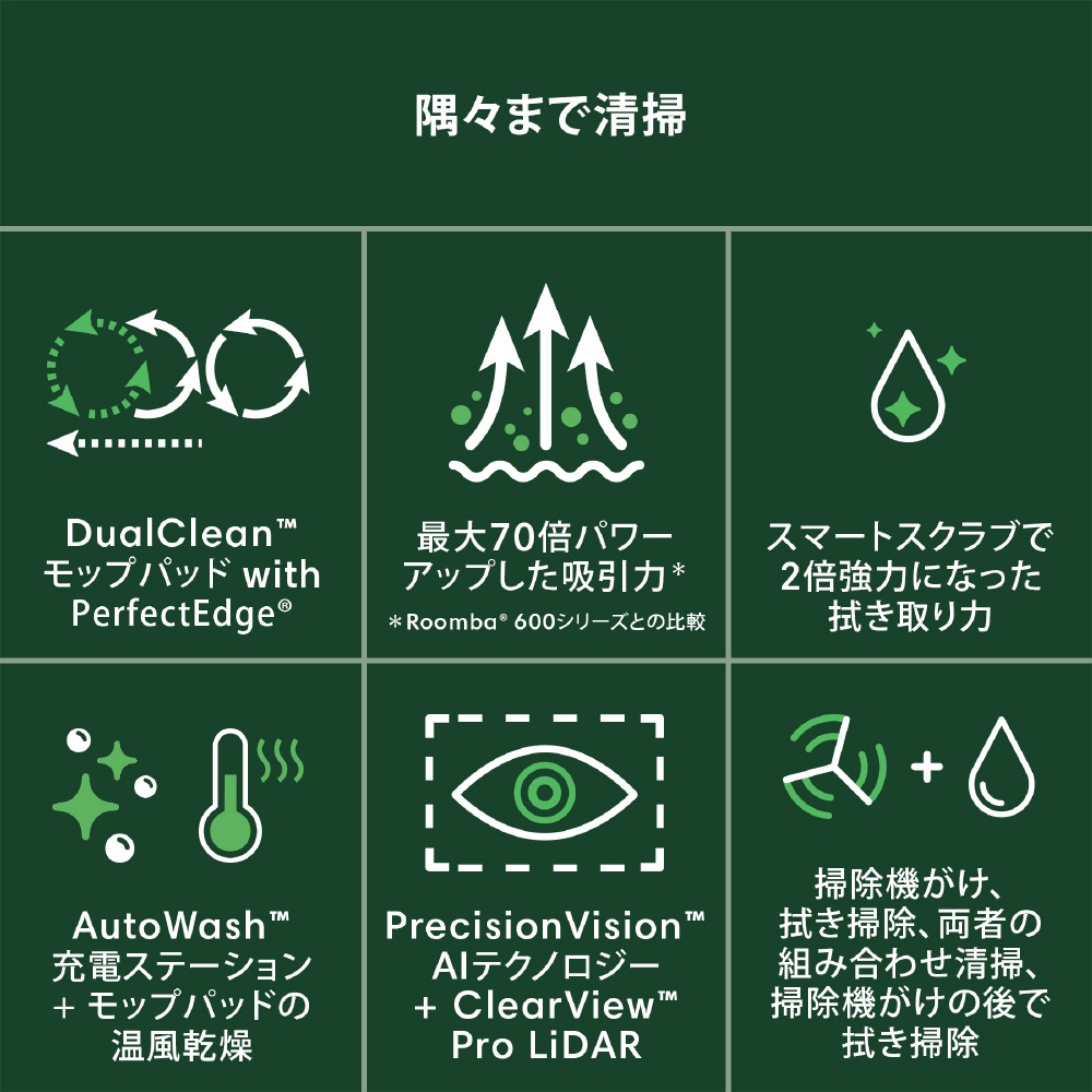 付属品 ロボット本体、バッテリー(内蔵)、AutoWash 充電ステーション(紙パック装着済み+交換用紙パックx1)、電源コード、パッドプレート&モップパッドx1セット(2個)、交換用DualClean モップパッドx1セット(2枚)