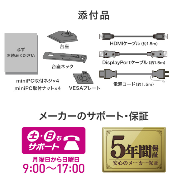 さらに、DisplayPortケーブル、HDMIケーブルを標準添付しており、ご購入後すぐにお使いいただけます。