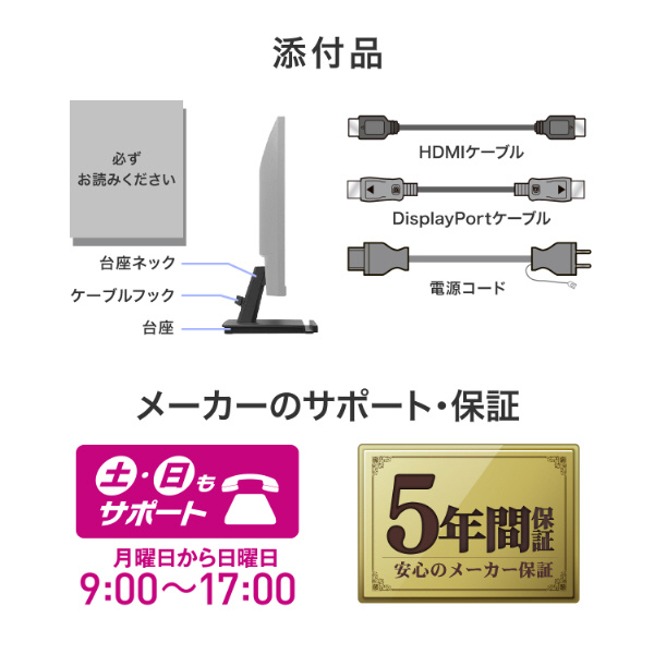 さらに、DisplayPortケーブル、HDMIケーブルを標準添付しており、ご購入後すぐにお使いいただけます。