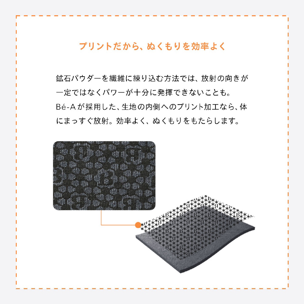 鉱石パウダーを繊維に練り込む方法では、放射の向きが一定ではなくパワーが十分に発揮できないことも。 B?-Aが採用した、生地の内側へのプリント加工なら、体にまっすぐ放射。効率よく、ぬくもりをもたらします。