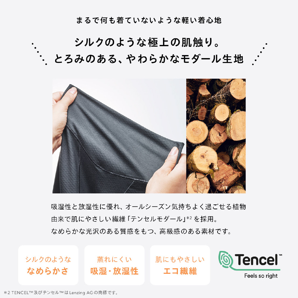 吸湿性と放湿性に優れ、オールシーズン気持ちよく過ごせる植物由来で肌にやさしい繊維「テンセルモダール」*2を採用。なめらかな光沢のある質感をもつ、高級感のある素材です。