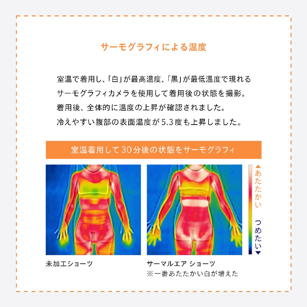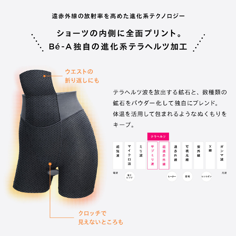 B?-Aが、初期モデルから全ての吸水ショーツに搭載してきた「ぬくもり設計」。最先端技術として注目を集めるテラヘルツを採用し、冷えの悩みに向き合っています。 2024年には、放射率を高めることに成功し、リニューアル。よりパワーアップしました。