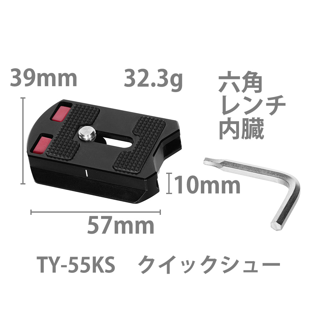 アルカスイス規格互換のクイックシュー(TY-55KS)が付属。クイックシューに六角レンチを付属させることで、撮影環境のセットアップ時間を効率化を図りました。このクイックシューはKSシリーズすべての雲台で利用可能です。