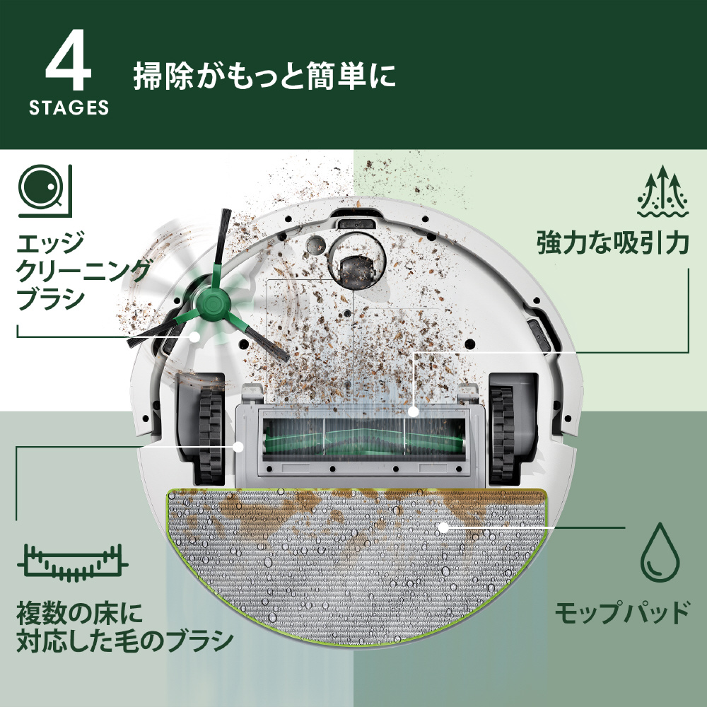 パワーアップした吸引力と、賢くなったナビゲーションで部屋の隅々までしっかり掃除機がけ、水拭きを行います。