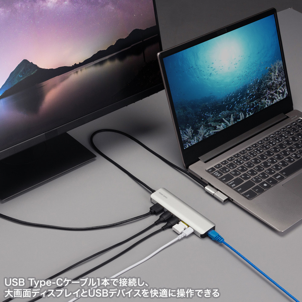 ■Type-Cケーブル1本でHDMIディスプレイやUSB機器、有線LANの拡張接続ができるType-Cモバイルドッキングステーションです。