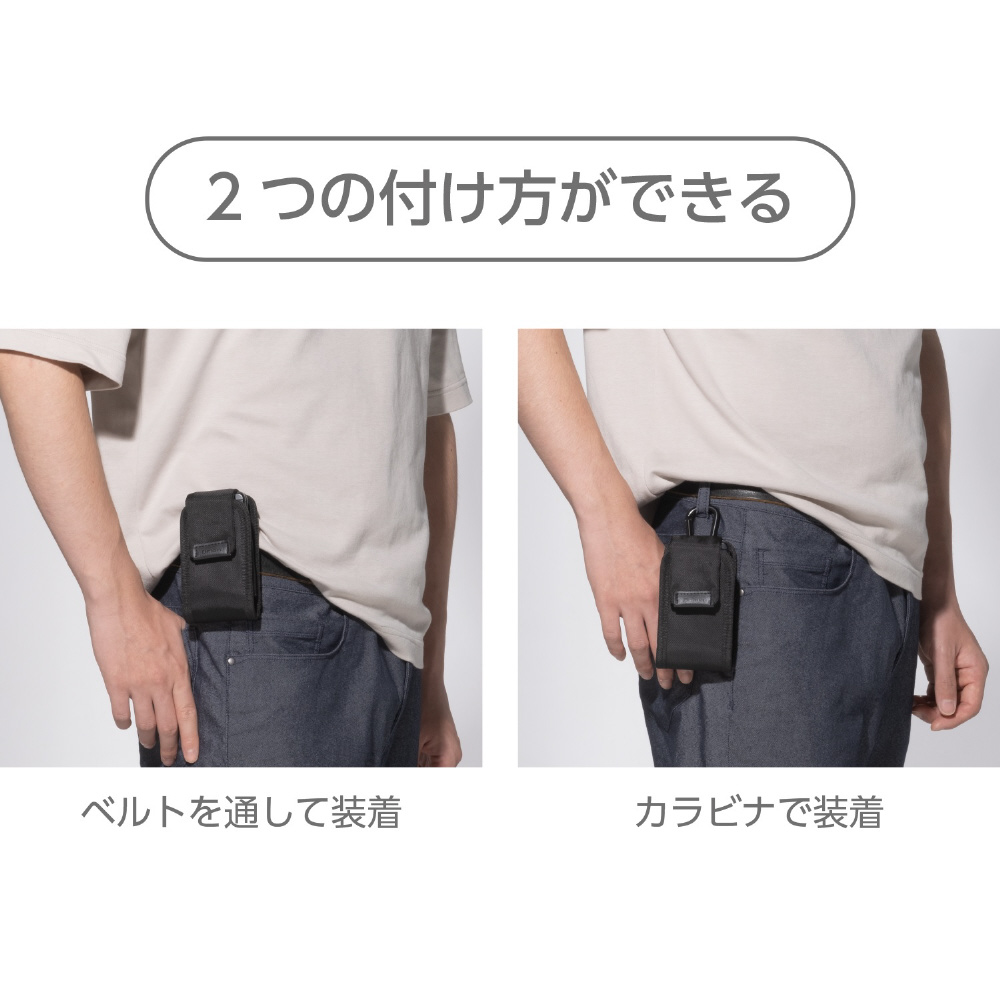 ・内側に起毛生地使用・着脱簡単なホック式ベルトホルダー仕様、カラビナ付
