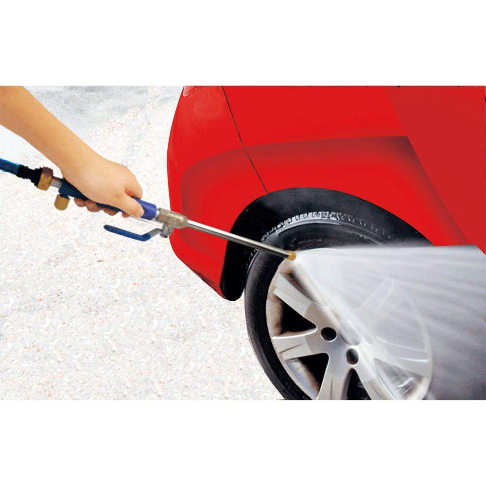 ホースにつなぐだけで電源不要の高水圧強力洗浄が可能なノズルです。狭いすき間汚れも協力に洗浄します。2種類のノズル付きで、ストレートは1点集中、フラットは広い範囲をカバーできます。手元のレバーで一時止水が可能なので水の無駄遣いを防ぐことができます。車の洗車、外壁やタイルの洗浄、庭などの花への水まきに最適です。