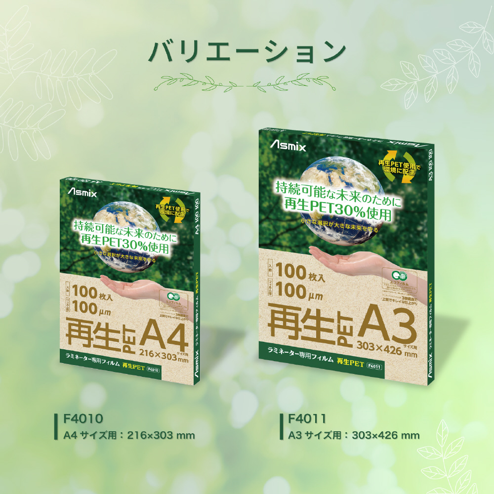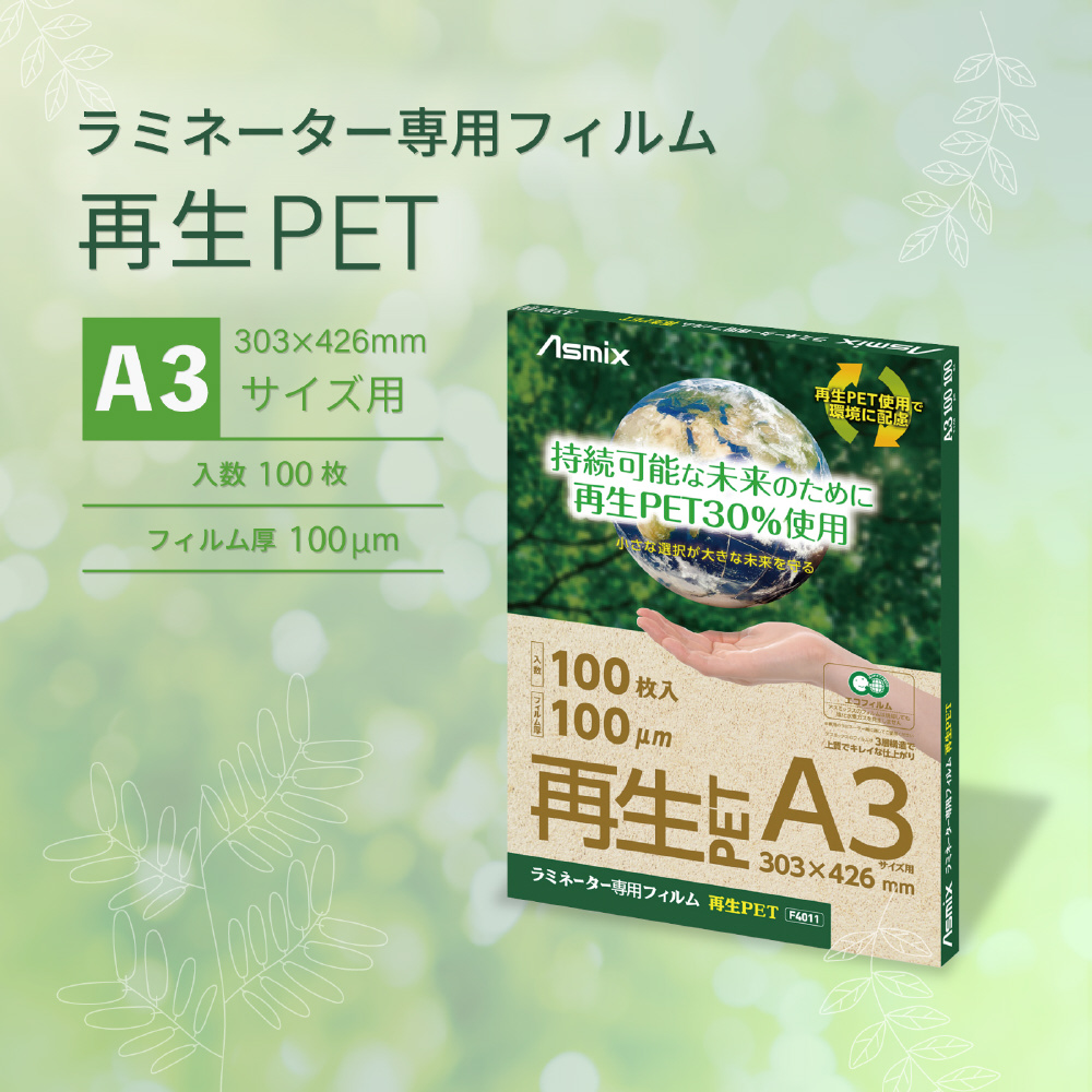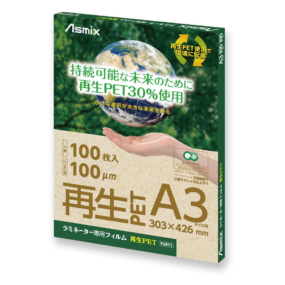 ラミネーター専用フィルム 再生PET 100μm A3サイズ 100枚入り F4011 Asmix F4011 [A3サイズ /100枚]