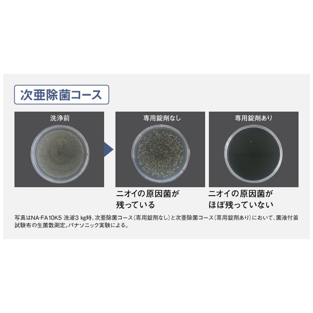 ※1 〈次亜除菌コースによる衣類除菌〉[試験機関](一財)日本食品分析センター[試験成績書発行年月日]2021年11月8日[試験成績書発行番号]第21020922001-0101号[試験方法]菌液付着試験布の生菌数測定[除菌方法]次亜除菌錠剤を用いた次亜除菌コースによる[対象部分]洗濯・脱水槽内の衣類[試験結果]菌の減少率99.9%以上(自社換算値)。衣類上のにおいの原因菌において。全ての菌に効果があるわけではありません。 / 〈次亜除菌コースによる槽除菌〉[試験機関](一財)日本食品分析センター[試験成績書発行年月日]2022年11月24日[試験成績書発行番号]第22053805001-0101号[試験方法]洗濯・脱水槽および外槽に取り付けた菌液付着試験布の生菌数測定[除菌方法]次亜除菌錠剤を用いた次亜除菌コースによる[対象部分]洗濯・脱水槽および外槽[試験結果]菌の減少率99.9 %以上(自社換算値)。