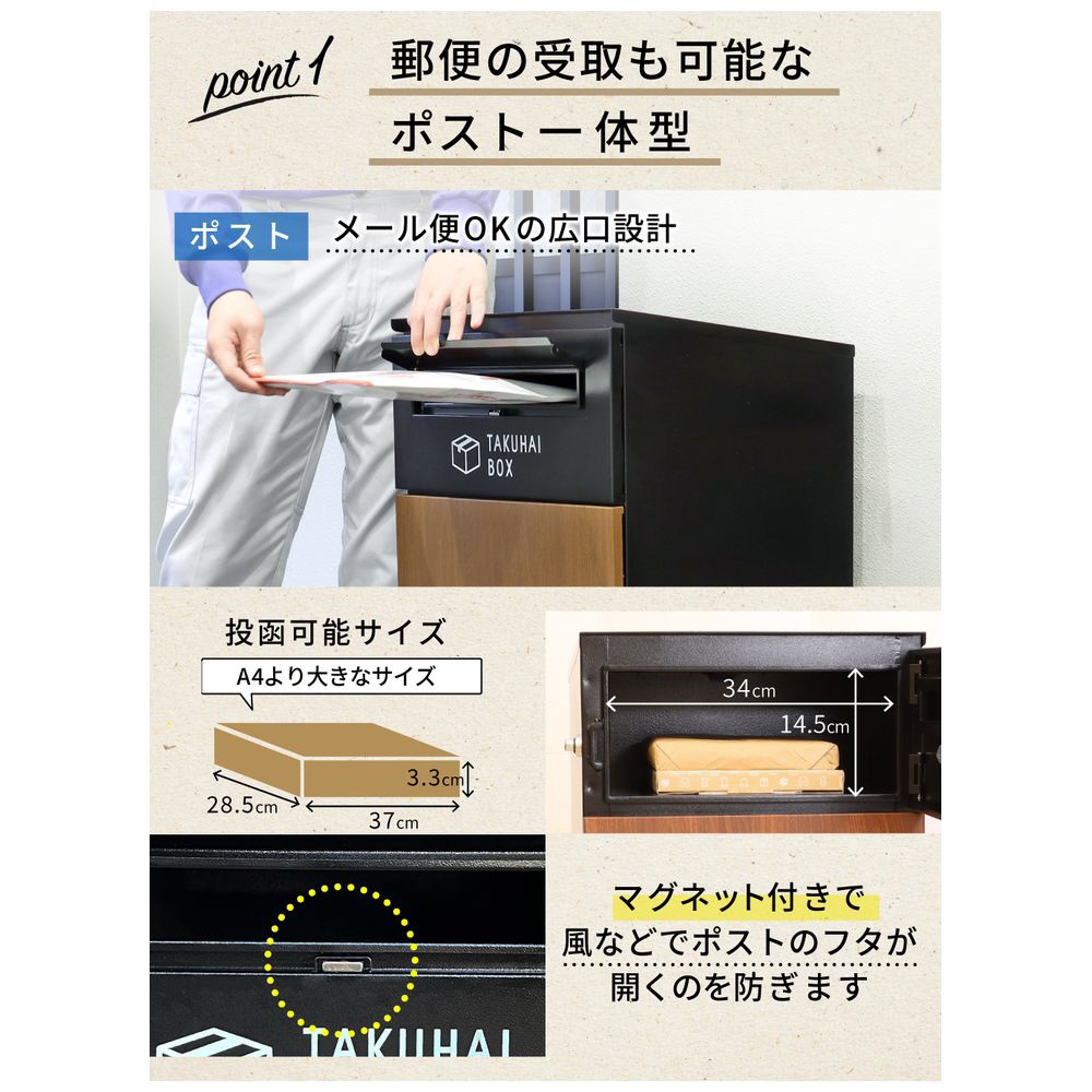 【郵便の受け取りも可能なポスト一体型】上部は広口のポストになっていてA4サイズより大きな回覧板、メール便なども受け取り可能!ポストのフタはマグネット付きで風などで開きにくくしています。