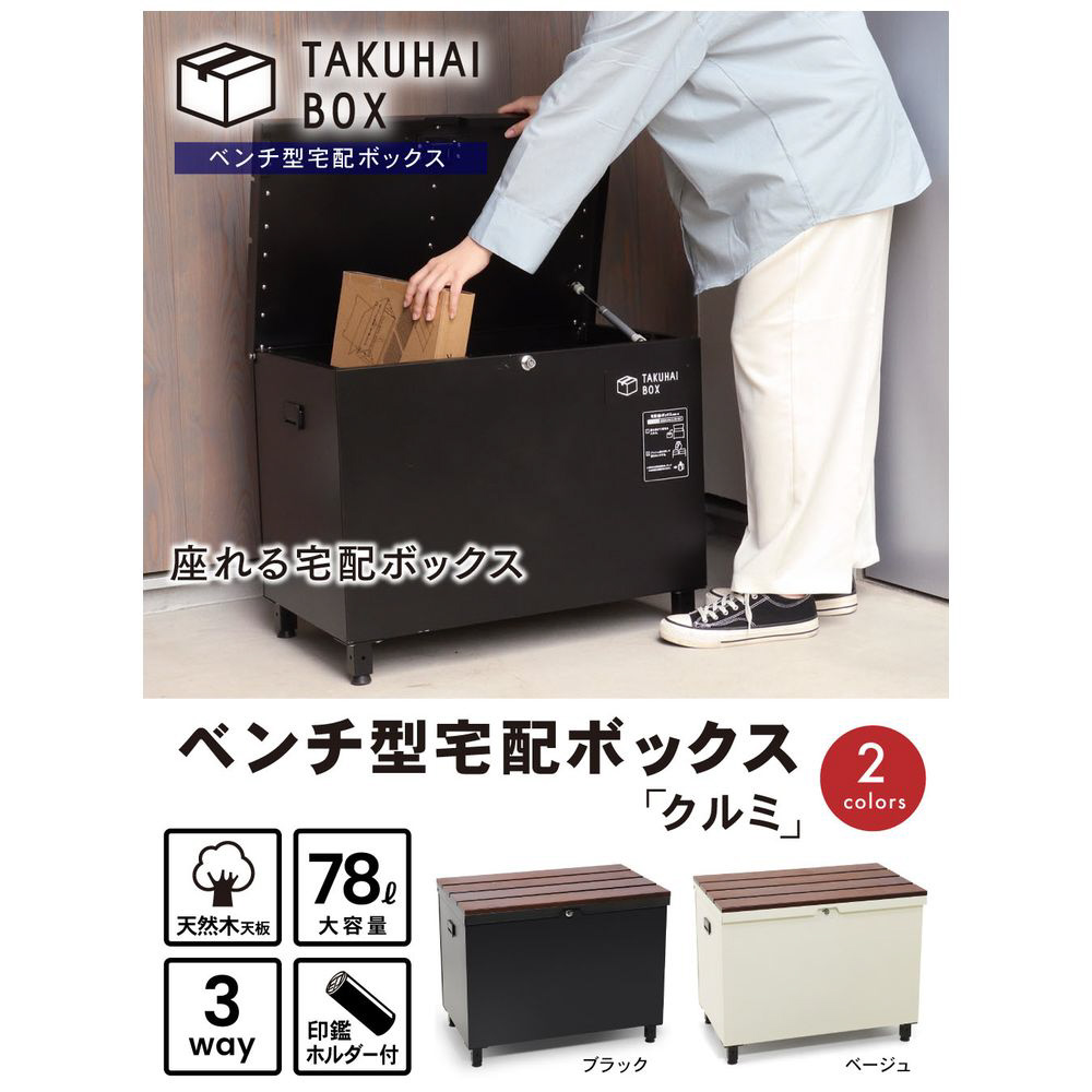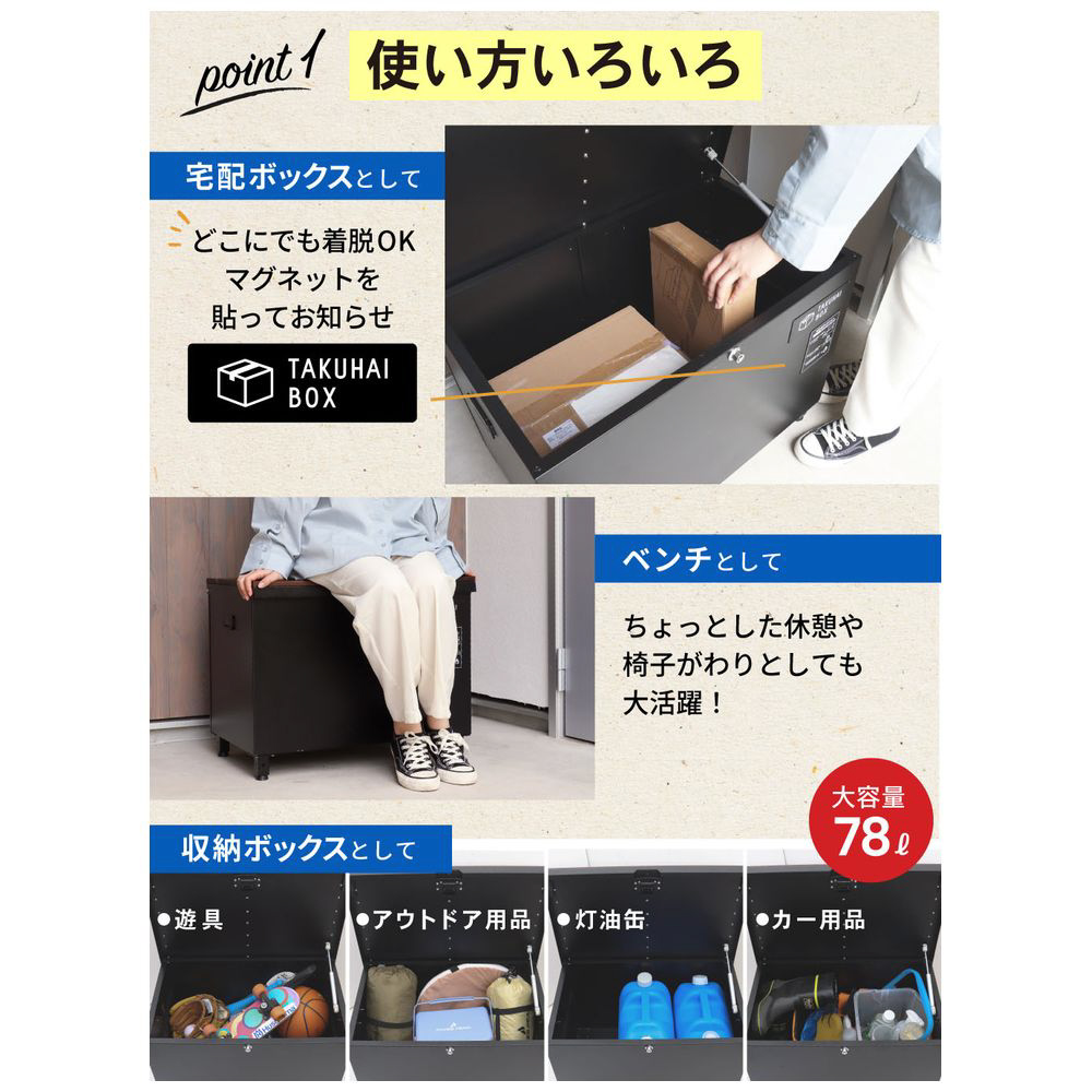 宅配ボックス、収納ボックス、ベンチなど用途に応じていろいろな使い方ができる便利なアイテム