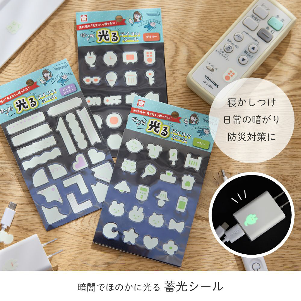 電気を消した後でも、ほのかな光で物の場所を教えてくれる蓄光シールです。お子さまを寝かしつけた後、暗闇でほんのりと光るため、起こしてしまうことなく必要な物を探し出せます。日常の暗がりはもちろん、突然の停電時といった防災対策にも活躍します。