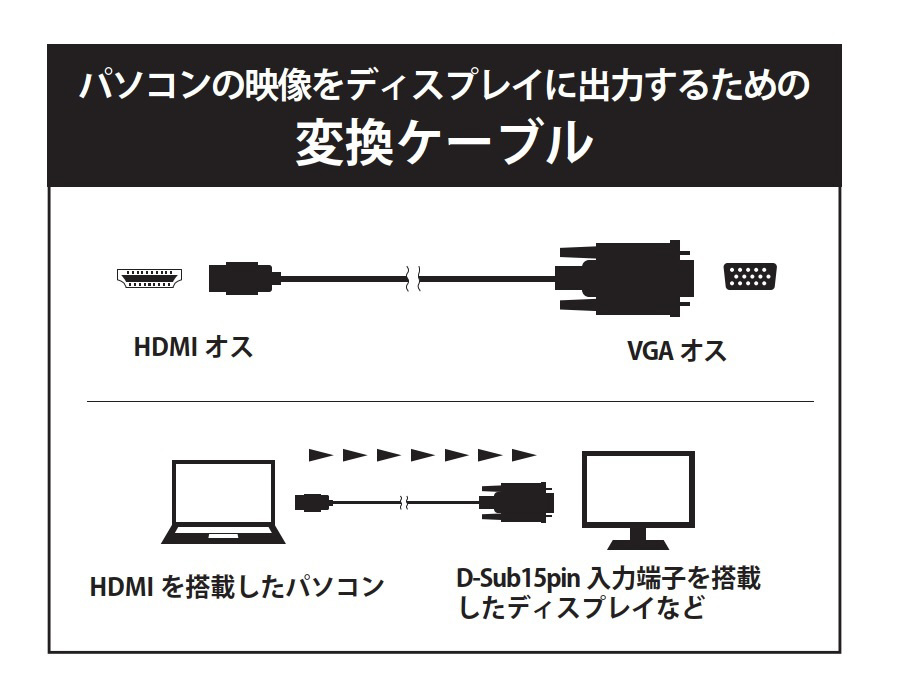 HDMI 端子を搭載した機器の映像信号を変換し、VGA(D-Sub15pin)入力端子を搭載したディスプレイ・テレビ ・プロジェクターなどに出力できます。