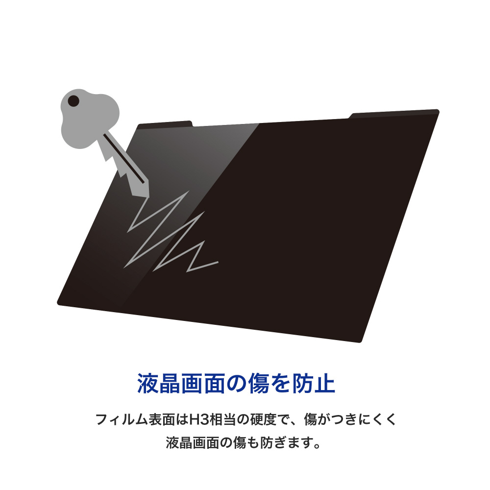 フィルム表面は3H相当の硬度で、表面に傷が付きにくく液晶画面の傷も防ぎます。使用上のフィルム曲がりに強く、耐久性のある作りになっています。