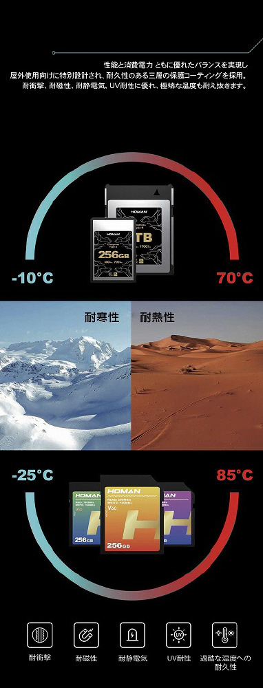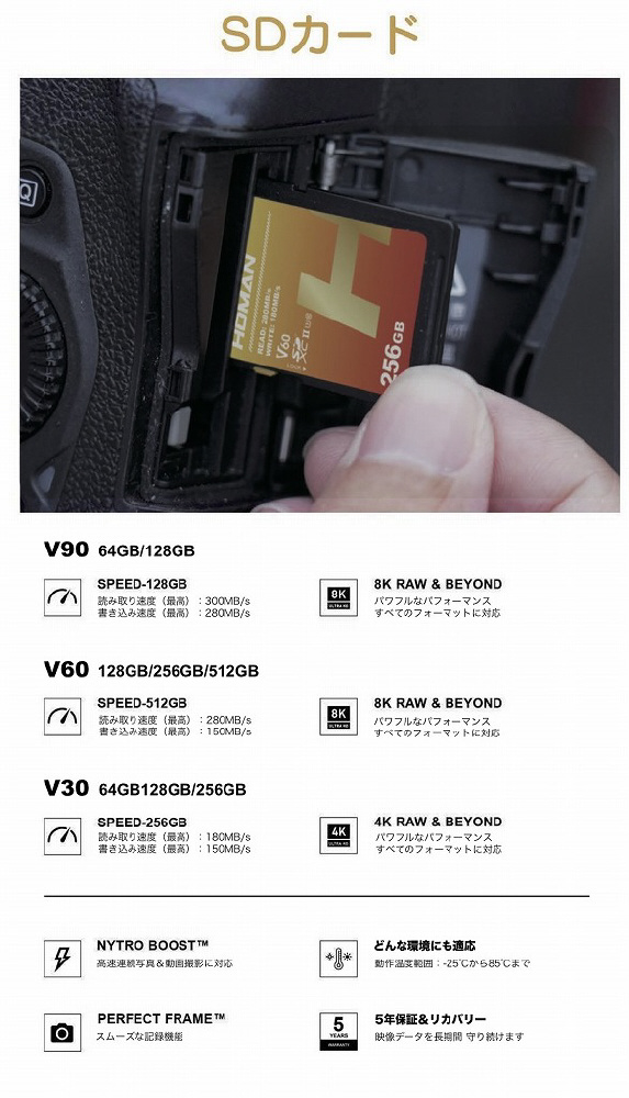 UHS-II対応、ハイビジョン録画も転送も高速、8Kに対応、過熱防止、5年保証&リカバリー