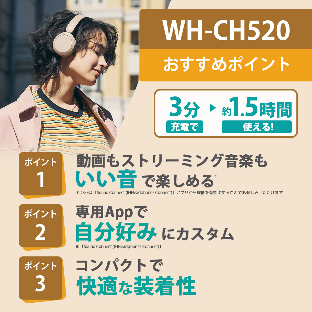 * ワイヤレス接続時連続音楽再生時間。コーデックはAAC。DSEE/イコライザーの搭載モデルはOFF設定時、またその他機能は全て初期設定時