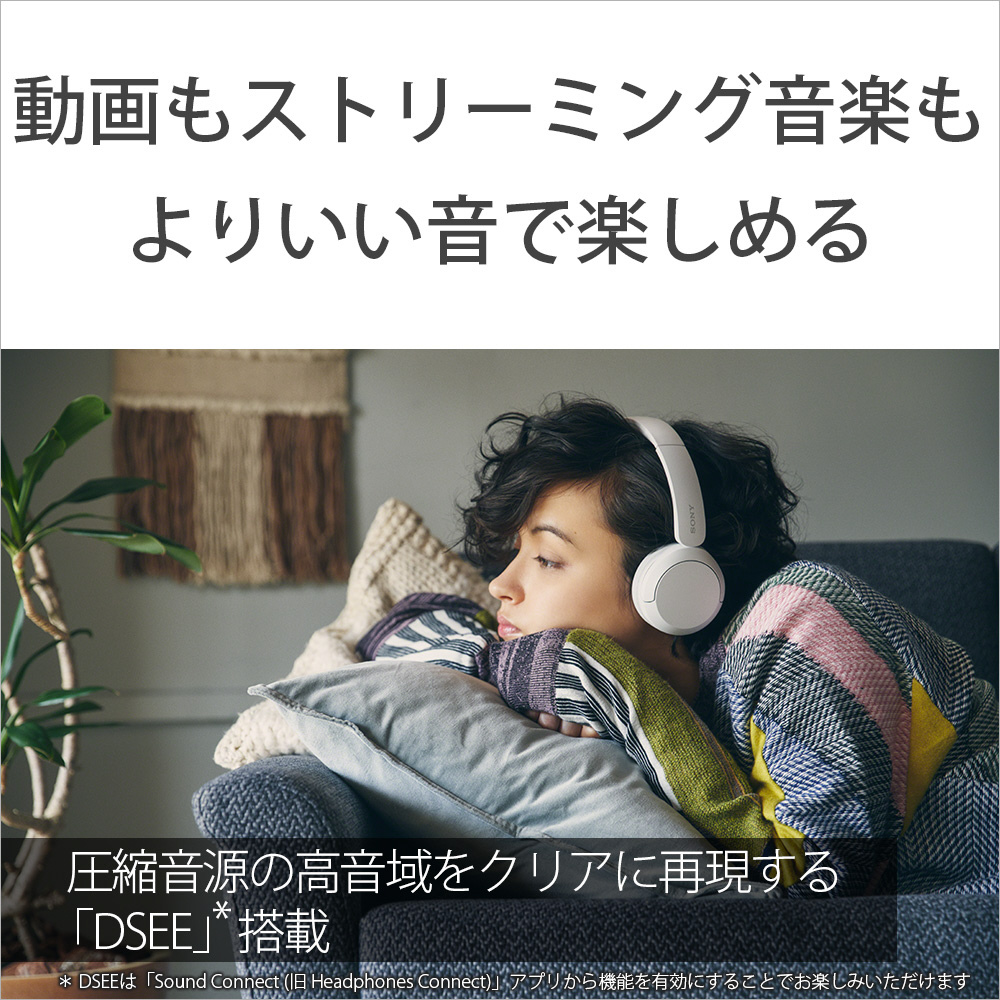 高音から低音までバランスが良く、ボーカルや楽器が自然でクリアな音でお楽しみいただけます。さらに、ソニーの独自開発技術「DSEE」により、圧縮された音源で失われがちな高音域をCD音質相当までヘッドホン内で補完します。ストリーミング再生やMP3、Bluetoothの伝送コーデックなどにより圧縮された音源を、広がりのあるいい音で再生します。
