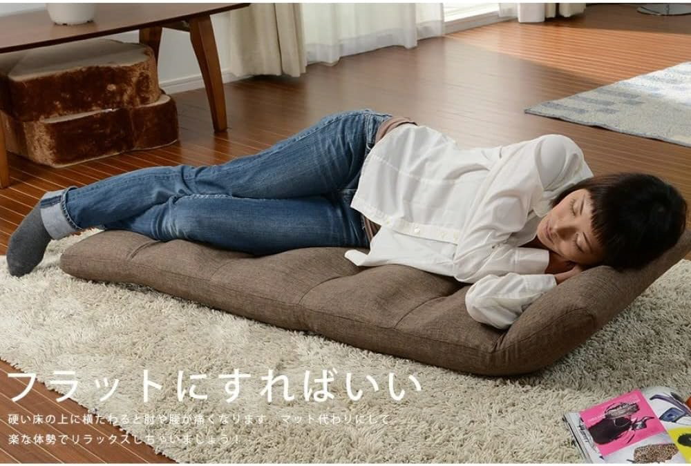使わない時は省スペースに保管できるリラックスチェア、脚の部分が下向きに曲がるタイプです。