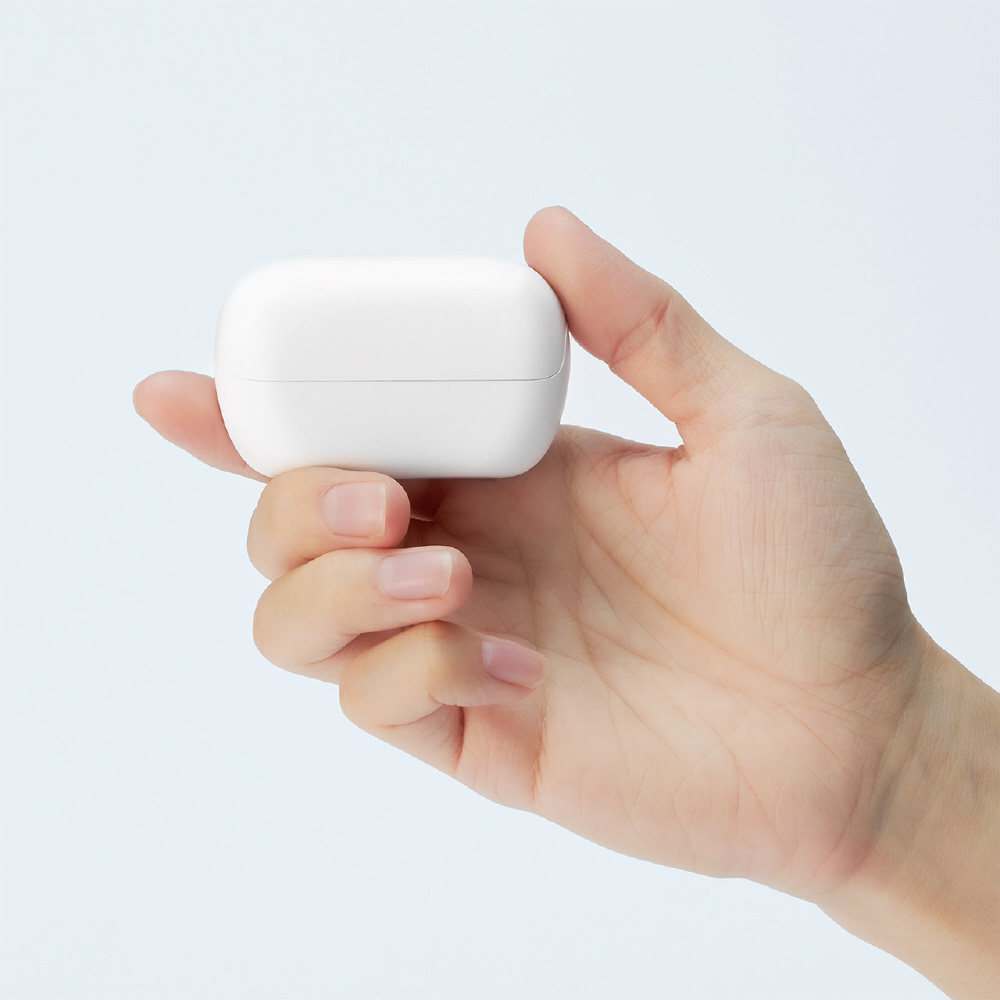 イヤホンを収納する充電ケースは、手のひらに収まる石鹸のような滑らかなフォルムを採用。
