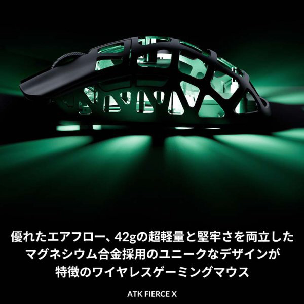 マグネシウム合金を採用したユニークな左右対称デザインによって、優れたエアフロー、超軽量と堅牢さを兼ね備えたワイヤレスゲーミングマウス『ATK FIERCE X』