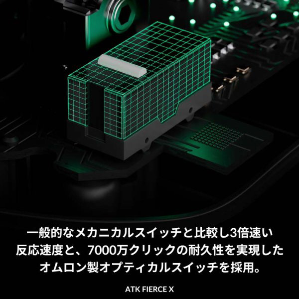 ■メインスイッチには、オムロン製のオプティカルスイッチを採用し、一般的なメカニカルスイッチより3倍速い反応速度と7000万クリックの耐久性を実現しています。さらに、高性能な「Nordic 52840」チップを搭載し、独自のワイヤレス技術「Smartspeed Wireless Gen-2」と「ATK ApexShark」ファームウェアを組み合わせ、0.4ms以下という圧倒的なクリックの反応速度を実現しています。また、設定用ソフトウェア「ATK V HUB」およびブラウザ上で設定変更が可能なWeb Driverに対応しており、好みやプレイスタイルに合わせて、マウスの設定をカスタマイズすることができます。