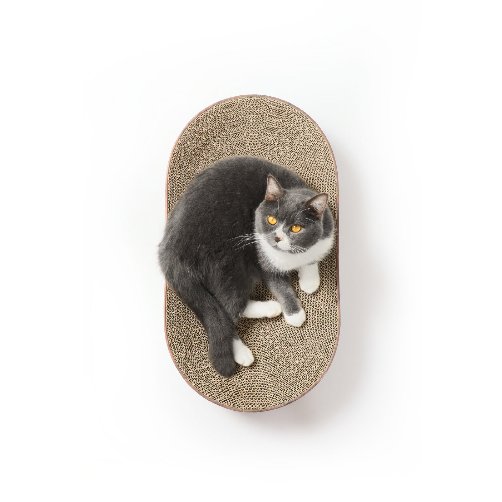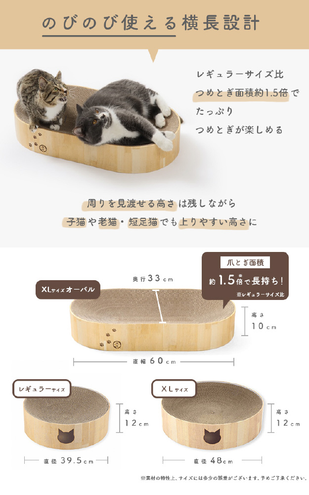 からだフィット形状のすり鉢ベッドはそのままに、幅60cmの横長設計で、からだを横に伸ばして寝ることも可能に。まんまる寝だけでなく、のびのび寝も楽しみたい大きめ猫におすすめです。