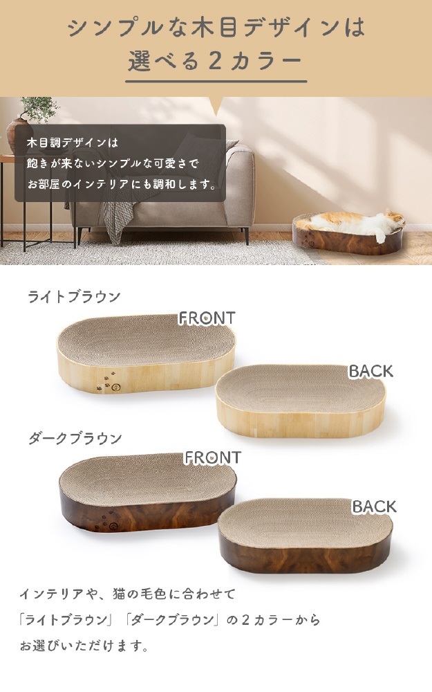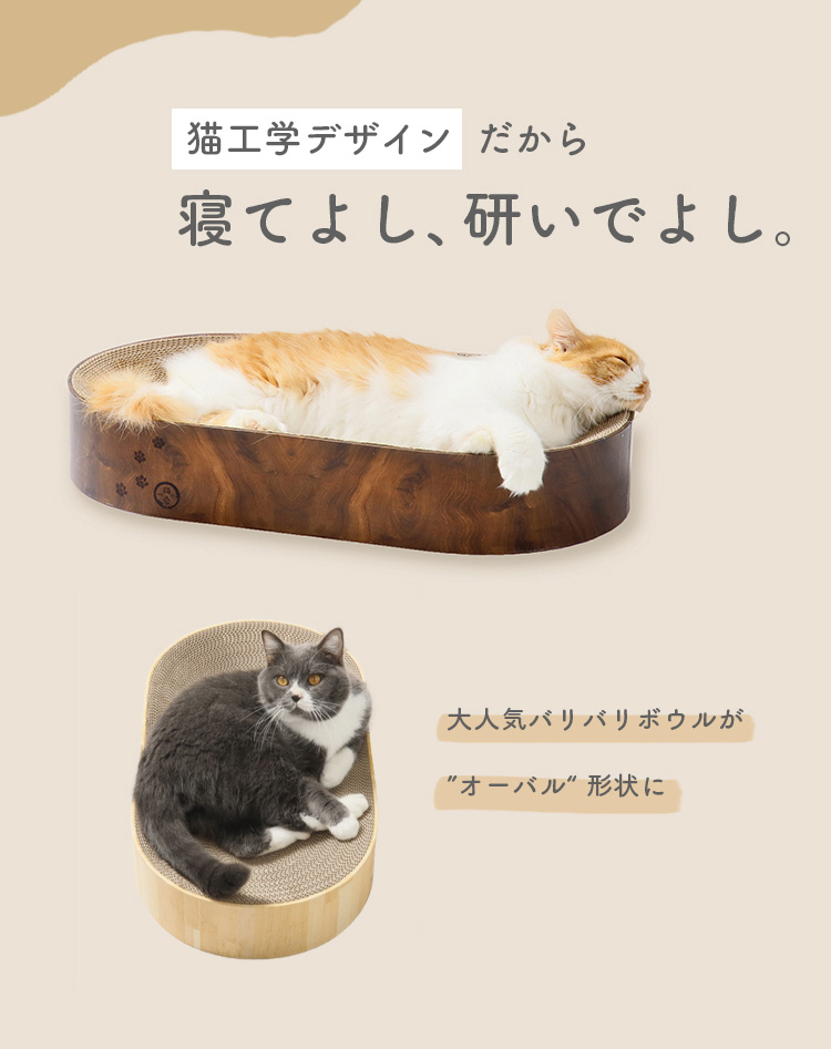 幅60cmののびのび設計なので、猫がつめとぎの上で、両手両足をついてしっかりとからだを伸ばして、つめとぎを楽しむことができます。猫はリラックスしてからだを伸ばしている時に、幸福ホルモンを放出すると言われています。つめとぎ後には、広々ベッドでくつろいで、猫だけの幸せ空間に。