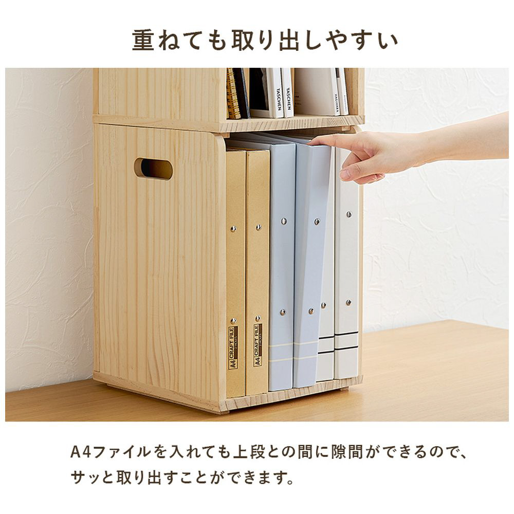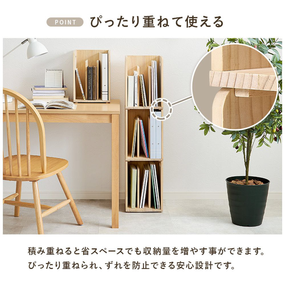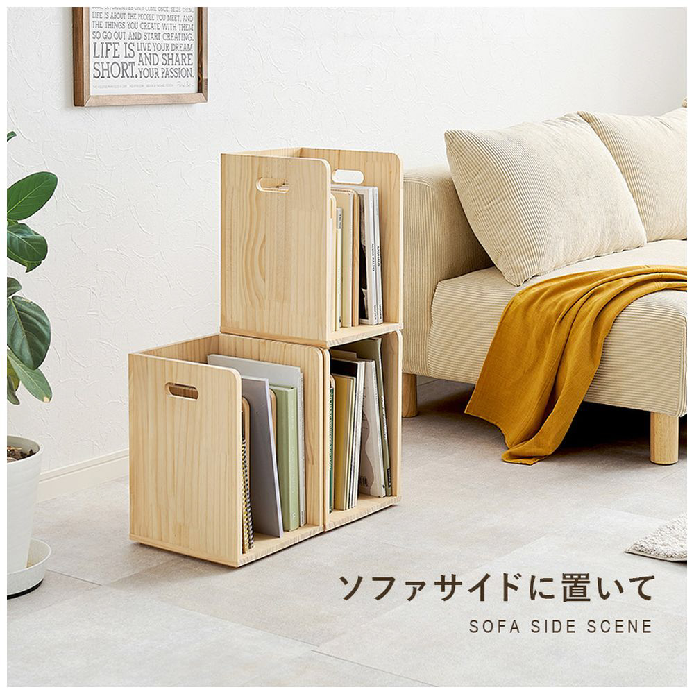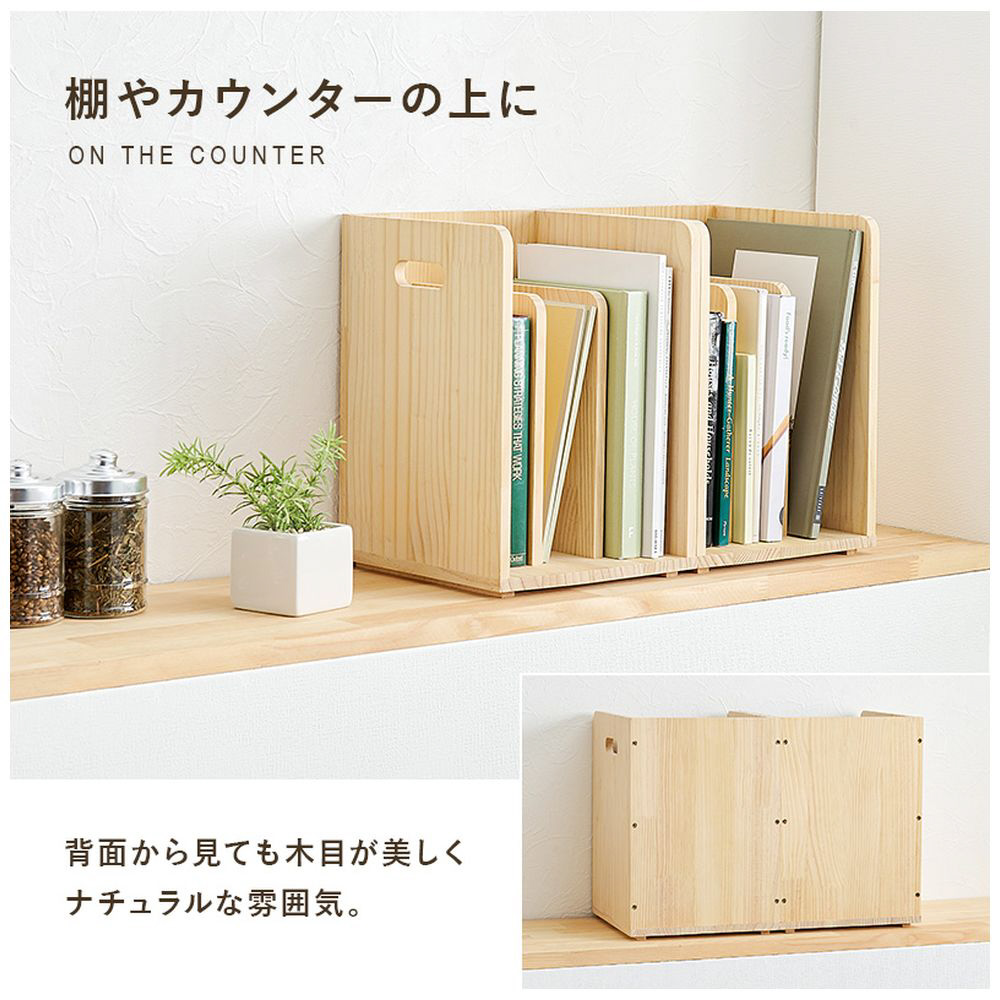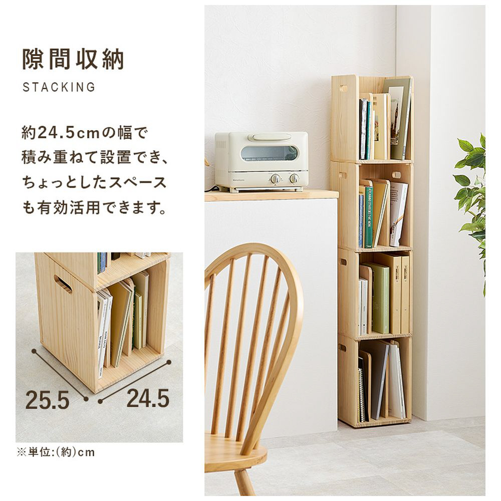 仕切りが付いて本・雑誌をしっかり収納。重ねて使えます。天然木パイン材を使用しており、無塗装なので経年変化を楽しんだりDIYでアレンジしたりできます。