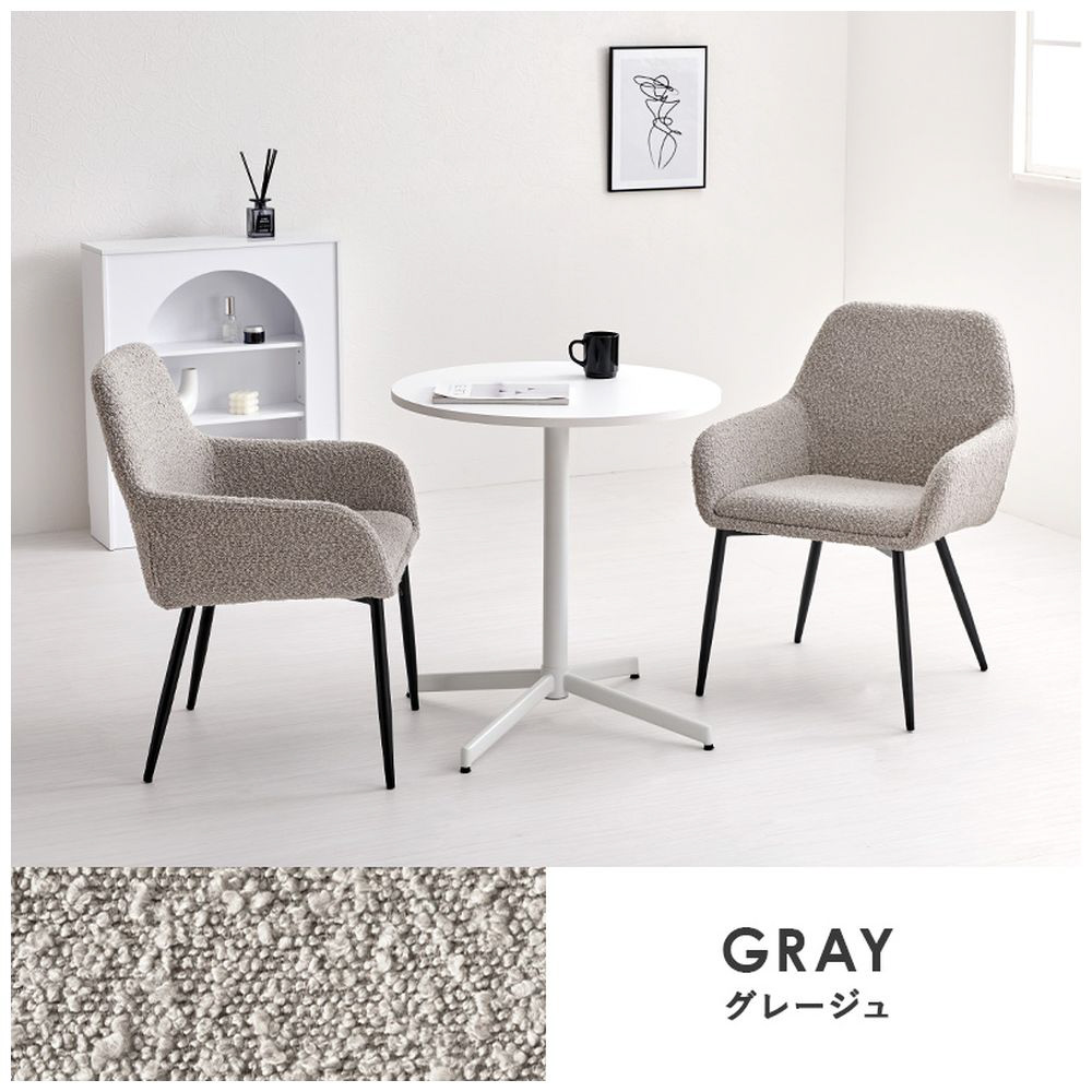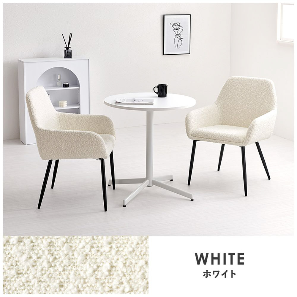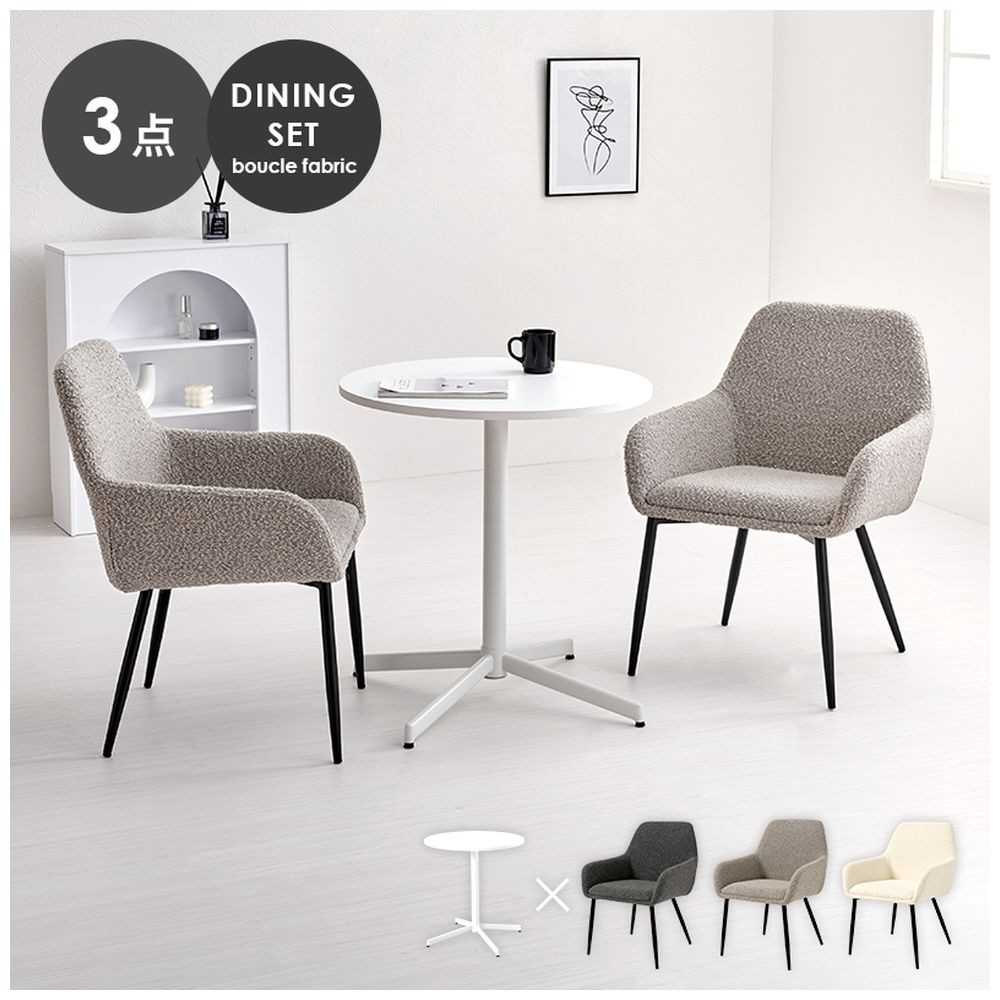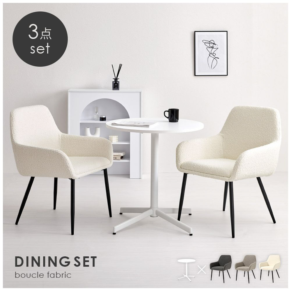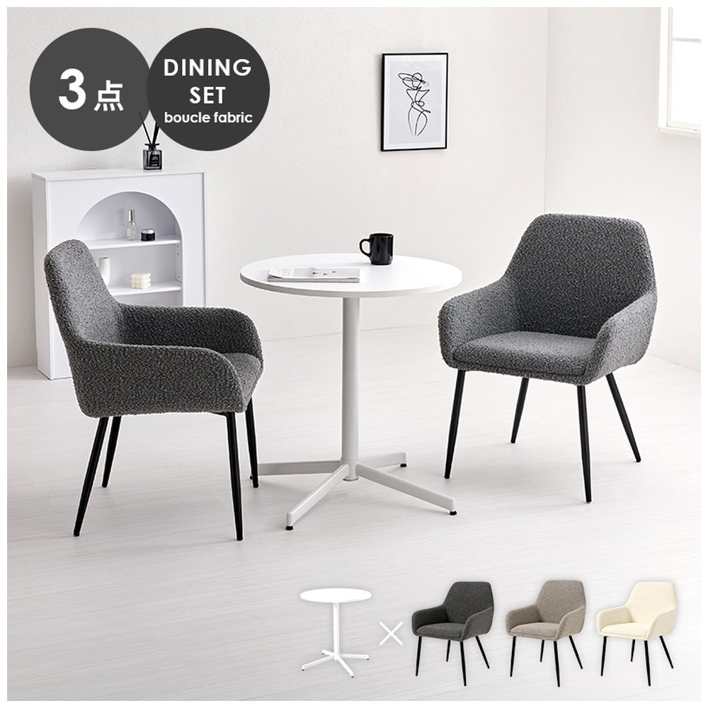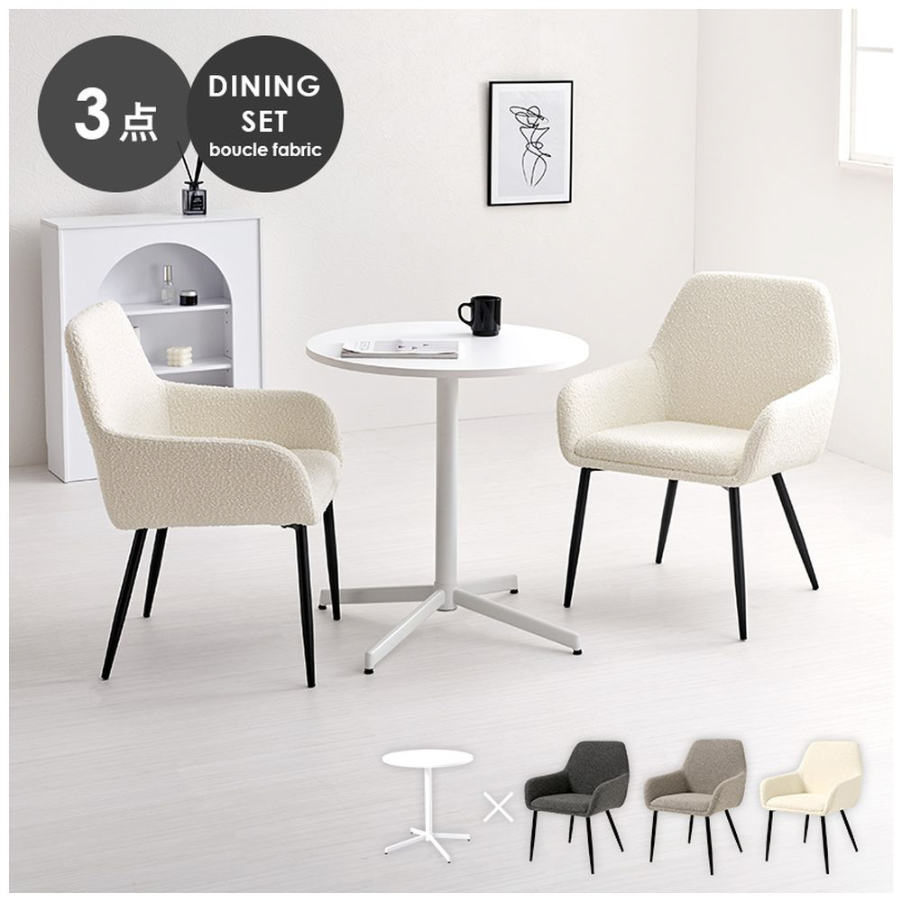 ぽこぽことした質感が特徴的なブークレ生地のチェアとホワイトカフェテーブルを合わせた、モダンでありながら温かみのある雰囲気の3点セット。