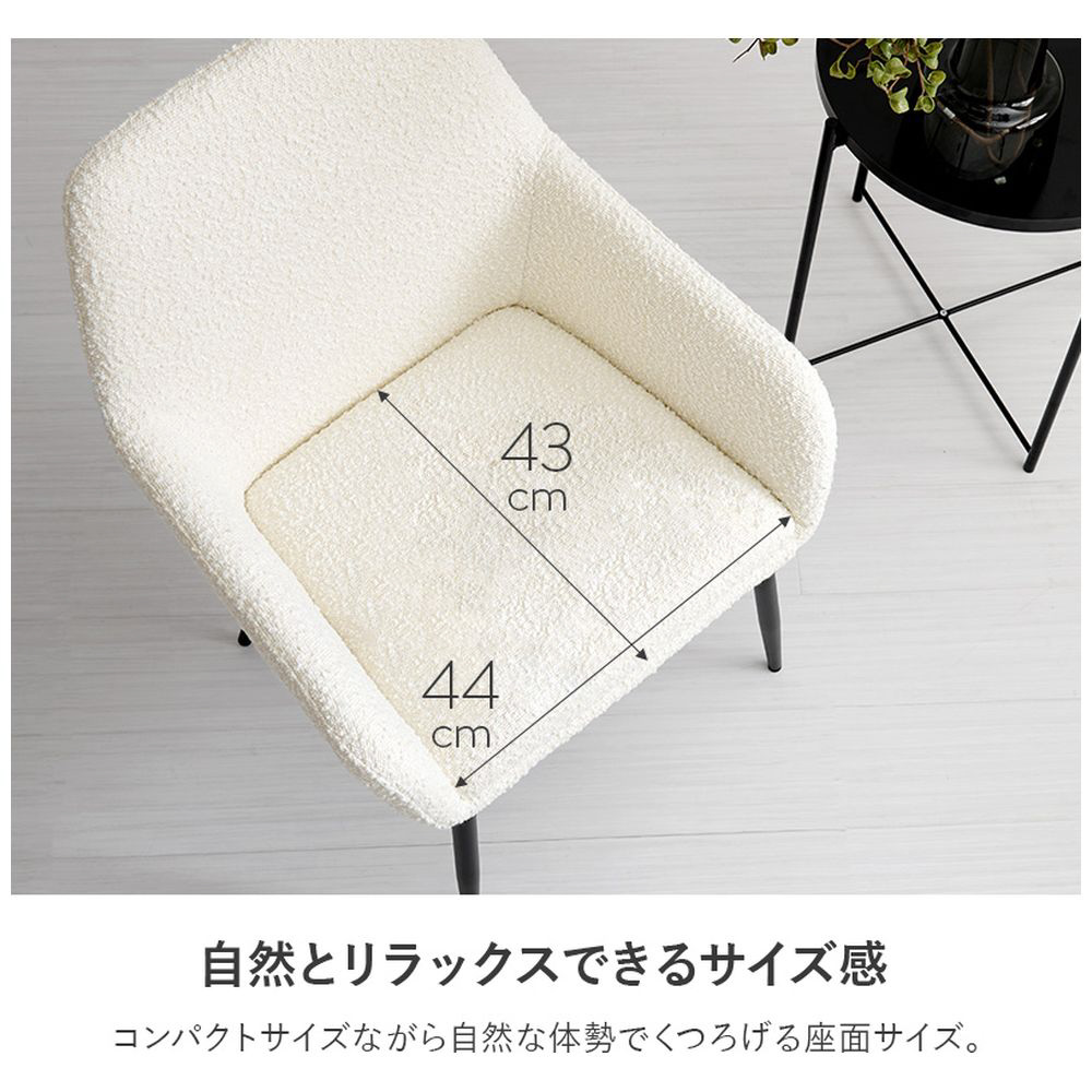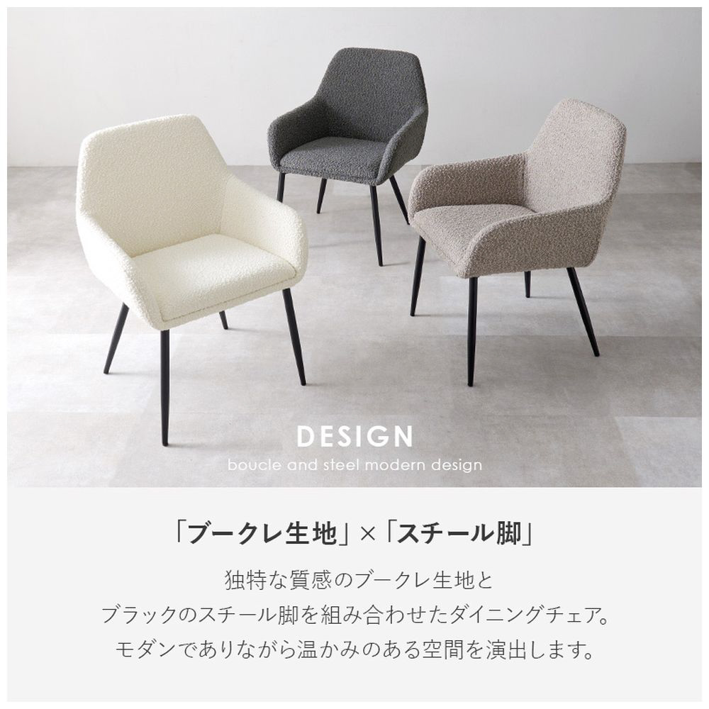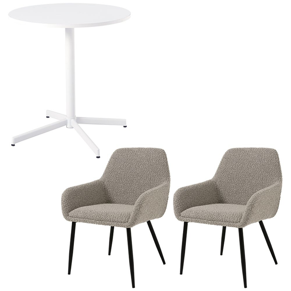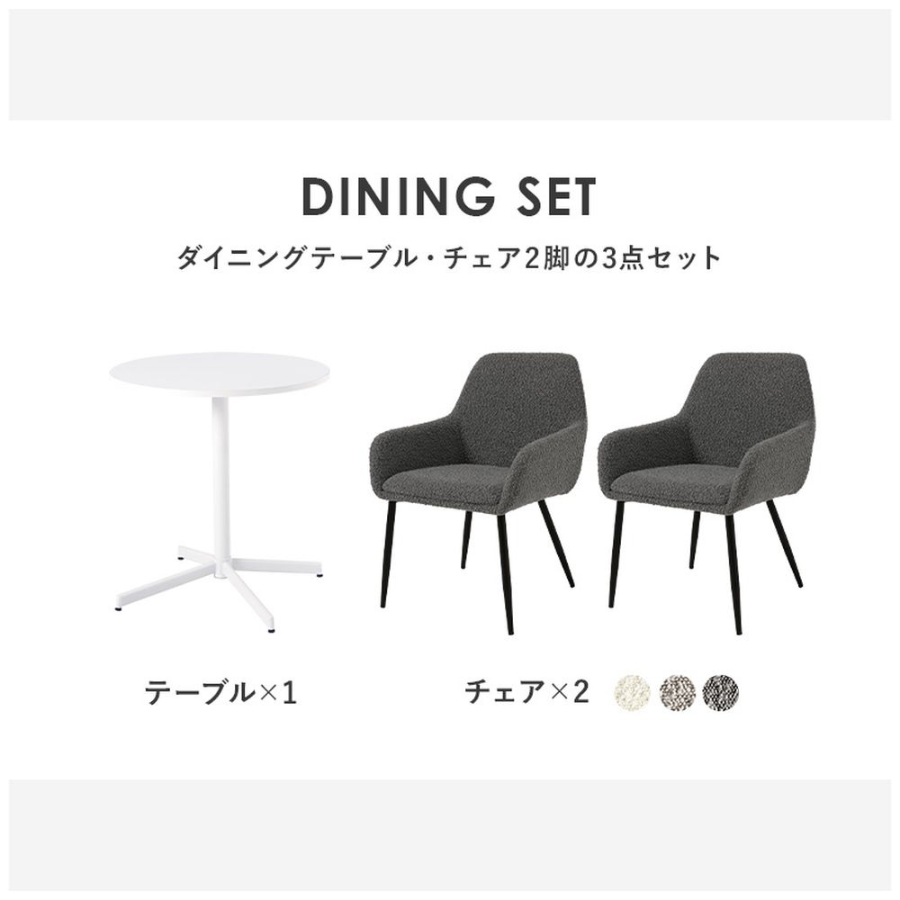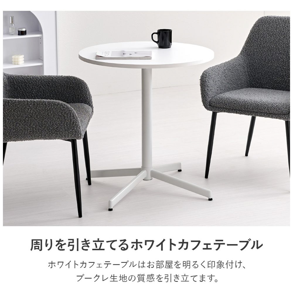 ぽこぽことした質感が特徴的なブークレ生地のチェアとホワイトカフェテーブルを合わせた、モダンでありながら温かみのある雰囲気の3点セット。
