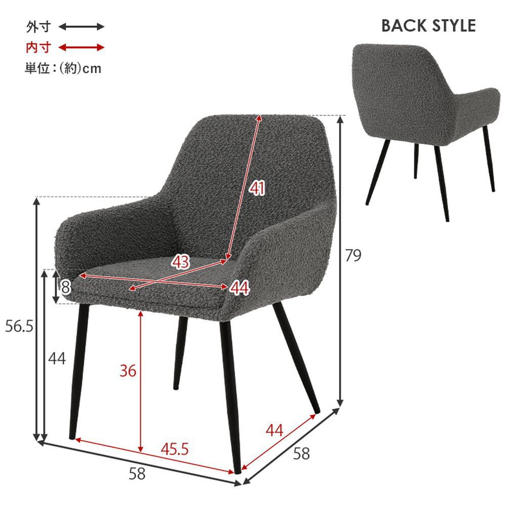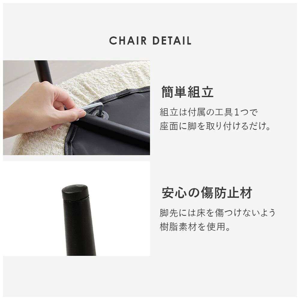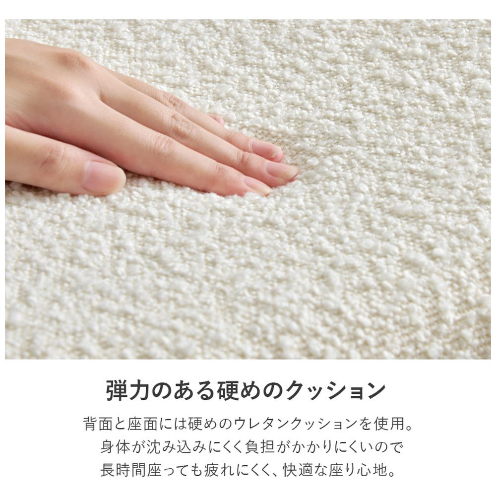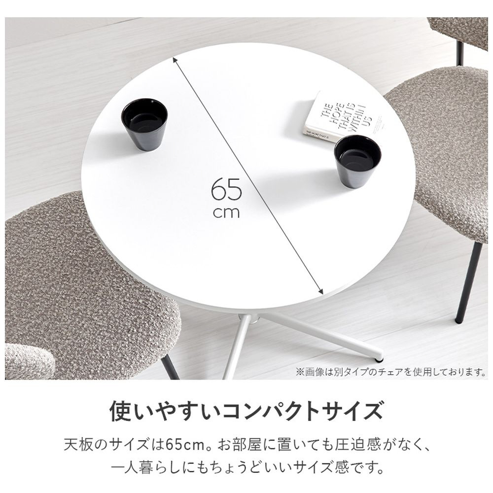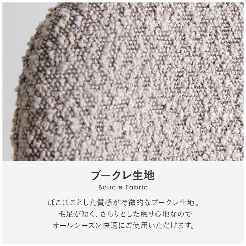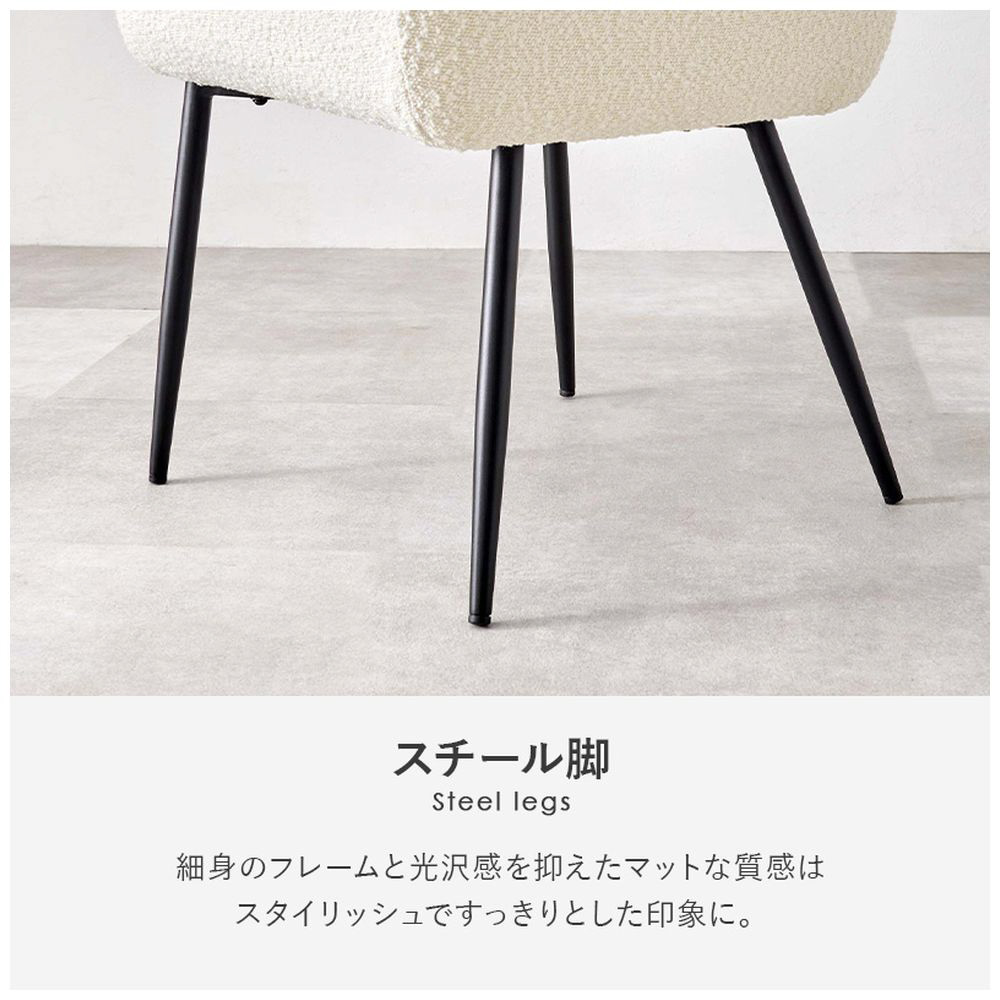 ぽこぽことした質感が特徴的なブークレ生地のチェアとホワイトカフェテーブルを合わせた、モダンでありながら温かみのある雰囲気の3点セット。