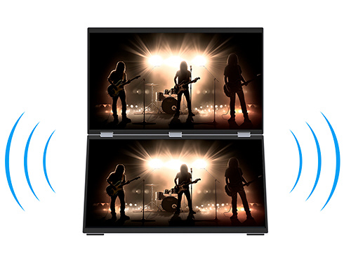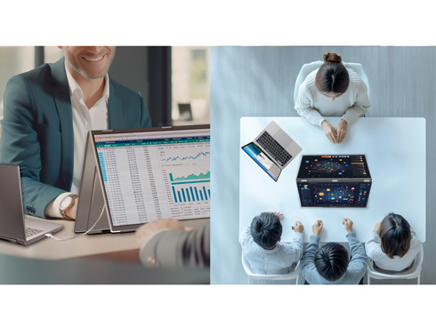 ■オートフリップ機能を搭載し、「拡張」モードや「ミラー」モード使用時に上部の画面を反対側に折り曲げると、ジャイロセンサーにより自動的に表示が上下反転します。どの角度でもスムーズに作業ができ、プレゼンテーションや資料の閲覧がさらに快適になります。例えば商談時に上部ディスプレイをお客様の方に向けて資料を見せて、もう1画面で確認しながら使用可能です。