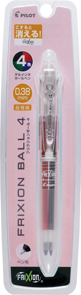 「フリクションボール4」は、1本で4色を使い分けでき、何度でも書き消し可能な利便性の高い4色ボールペンです。インキ色は黒・赤・青・緑。ペン先は0.38mmと0.5mmの2種類で、手帳や資料などの細かい箇所への書き込みに適しています。またクリップは当社オリジナルのリフトクリップを採用。厚いものでもしっかり挟め、10万回はさんでもこわれません(パイロットコーポレーション社試験データによる)。