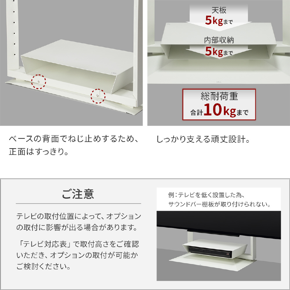 棚板は内部と天板の上の2段に収納が可能。内部に収納すれば目立たずスタンドと一体化。取付位置は台座の上部のみになります。収納の耐荷重は天板面が5kg,内部が5kgの合計10kgまで。