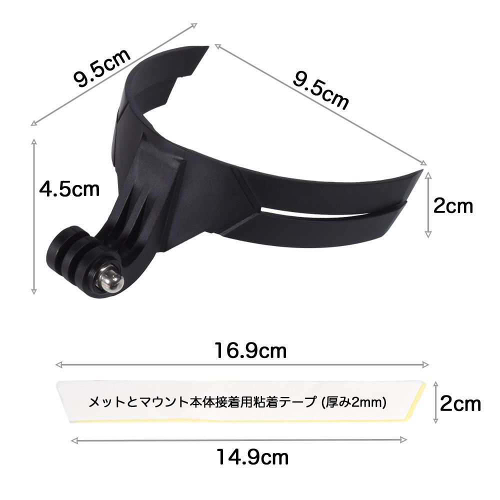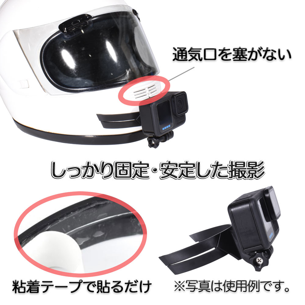 ヘルメットの顎部分に粘着テープで貼り付け、アクションカメラを取り付けるマウントです。ヘルメット曲面に沿ってガッチリと固定できるため、安定した撮影ができます。