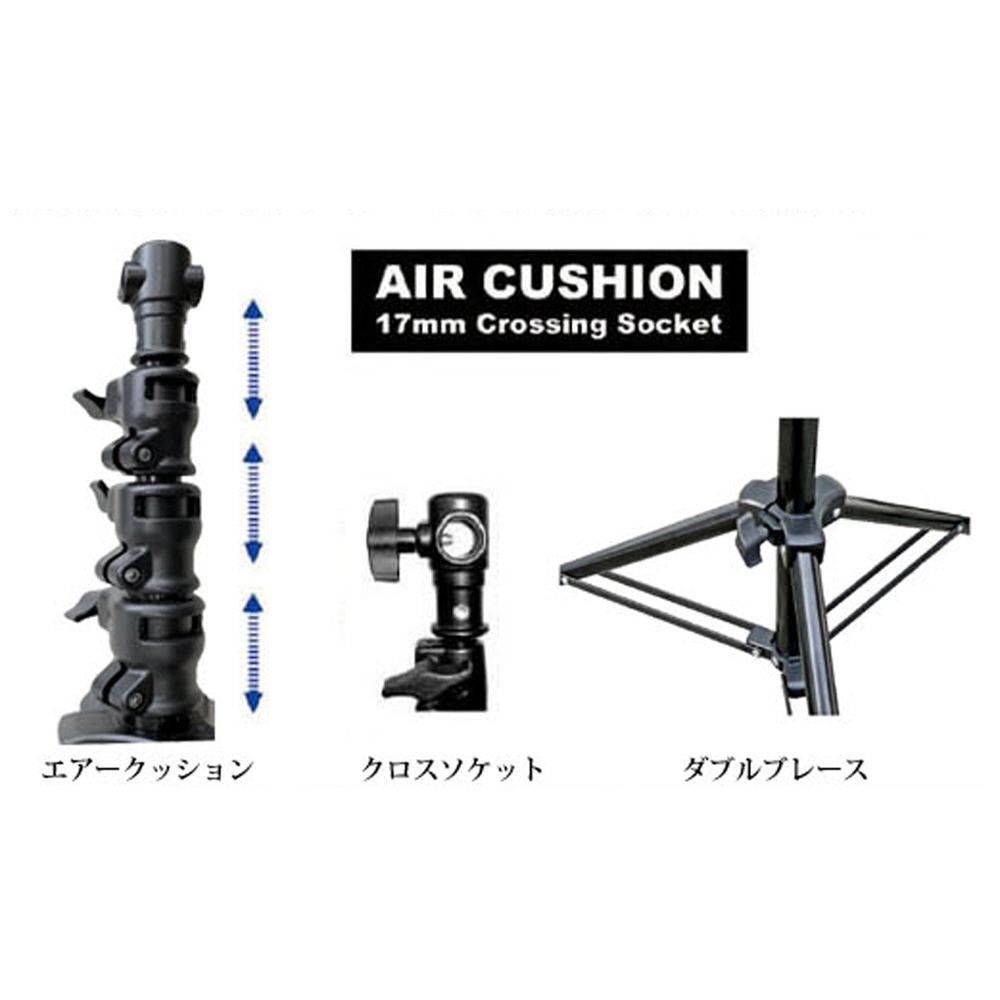 主要部分にアルミ材を使用した、17mmクロスソケットタイプのライトスタンドです。縮める際の落下スピードを緩めるエアークッション機構を採用。作業時の安全性を高めています。開脚部はねじれに強いダブルブレースを採用。最大積載重量は4kg。