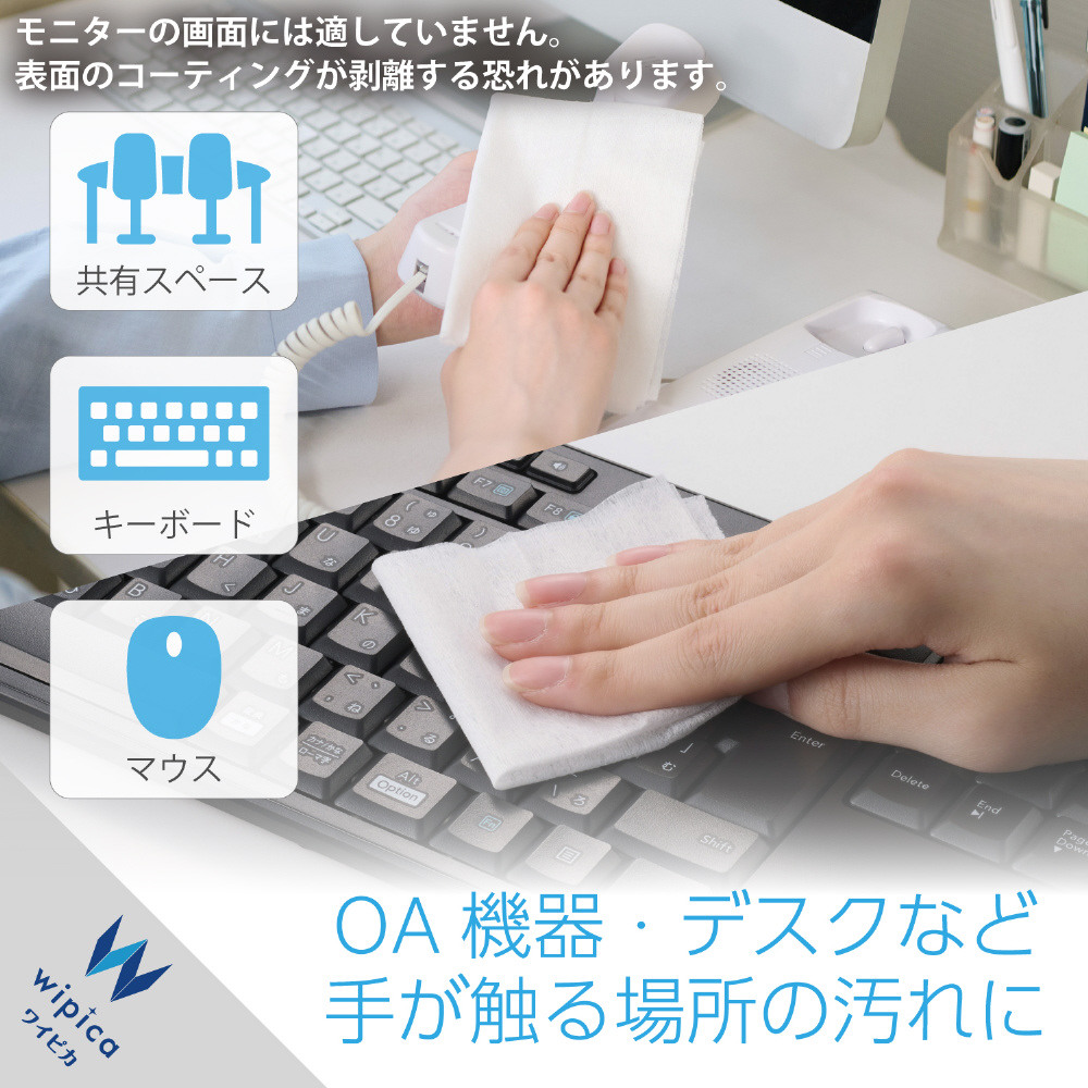 キーボード、マウス、受話器、その他OA機器、共有スペースなどの汚れ取り、除菌にご使用できます。